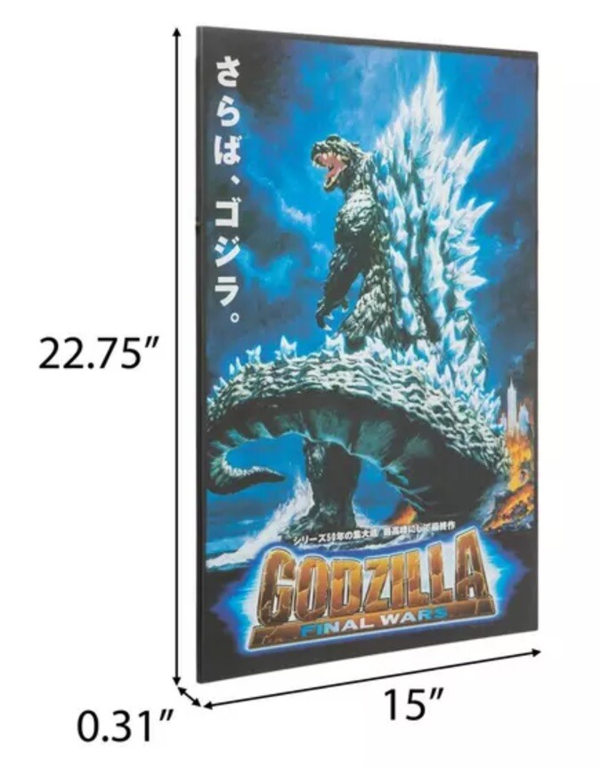 Showcase your love for Godzilla with this stunning piece of wall decor! The Godzilla Final Wars Wood Wall Decor measures 15"x23" and features a beautiful blend of blue, black, white, and gold colors. Crafted from high-quality wood, this item is perfect for collectors and fans alike. The wall decor is adorned with the iconic Godzilla character and has a primary material of wood. The multi-color design and attention to detail make it a unique addition to any room. Whether you're a fan of the movies or simply appreciate the intricate design, this item is a must-have for any collector or home decorator.