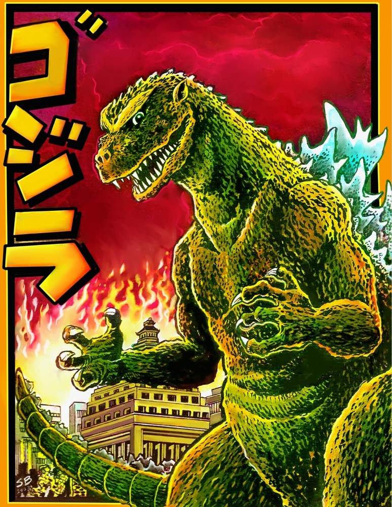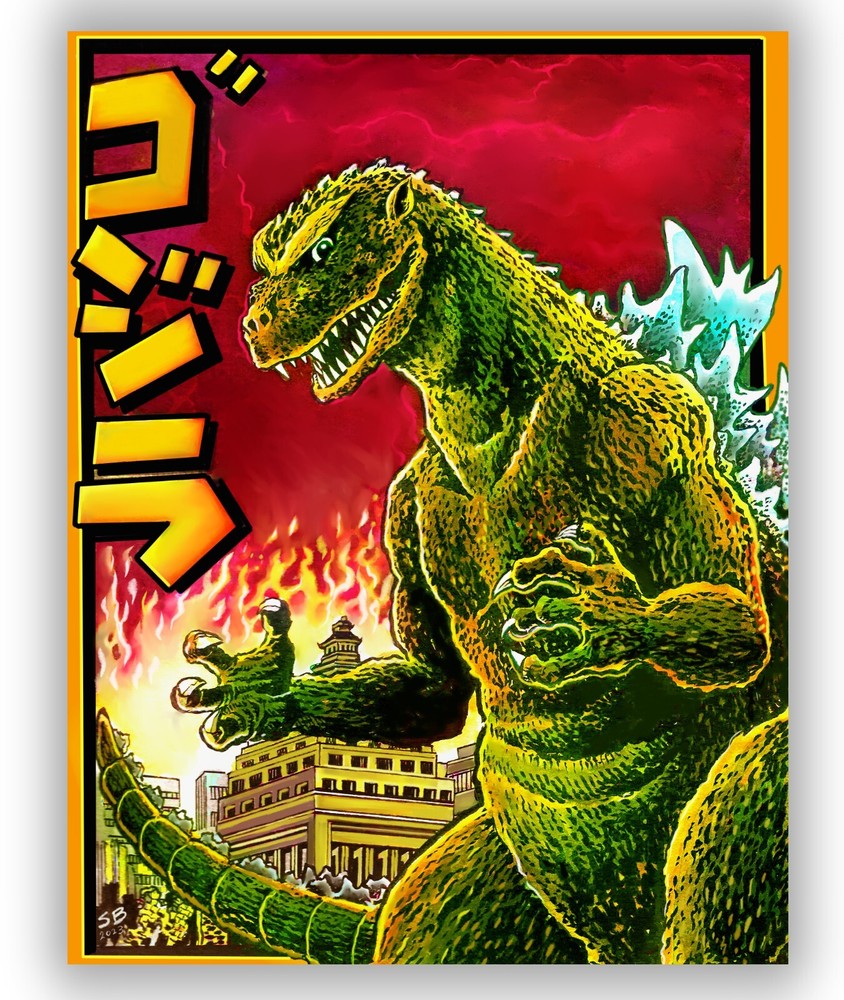 8.5" x 11" art print on 110 lb paper of Godzilla in his original form as portrayed in the 1956 film Godzilla, King of the Monsters . Piece drawn, inked, and colored by artist Steven Butler.