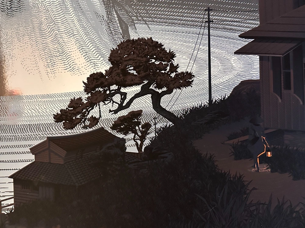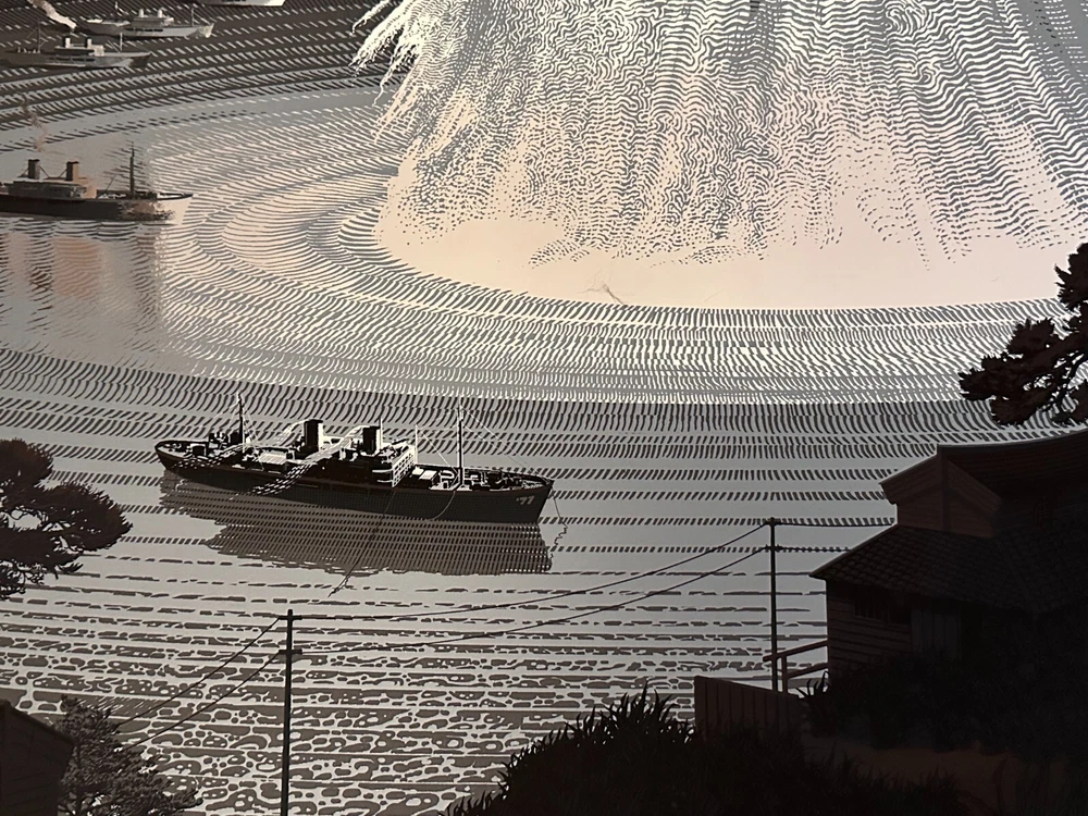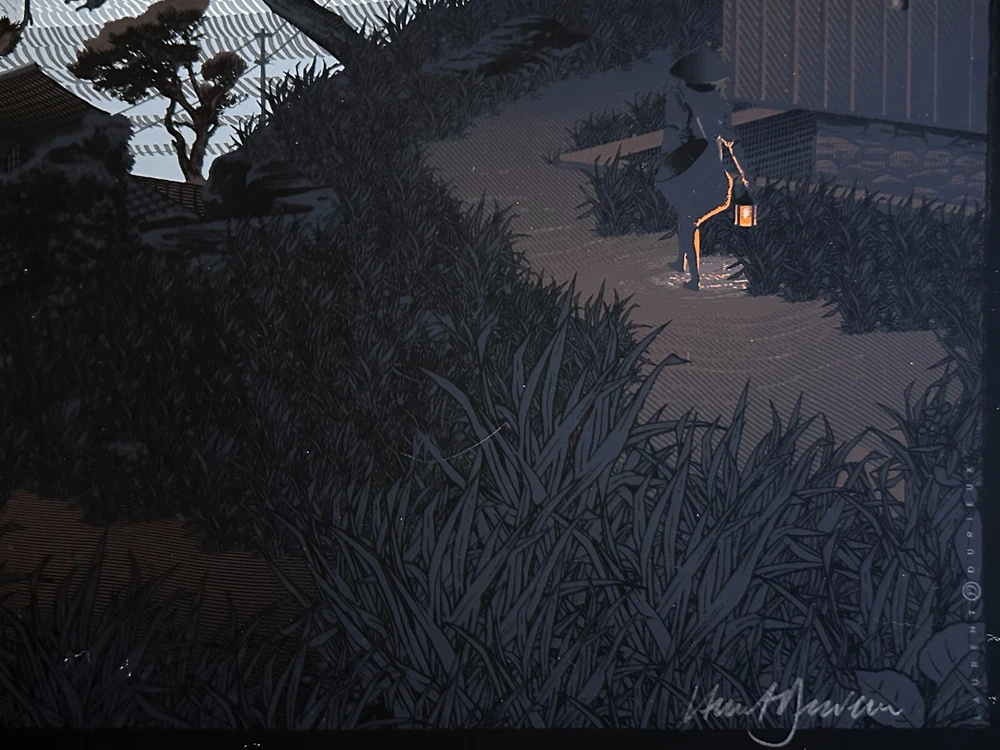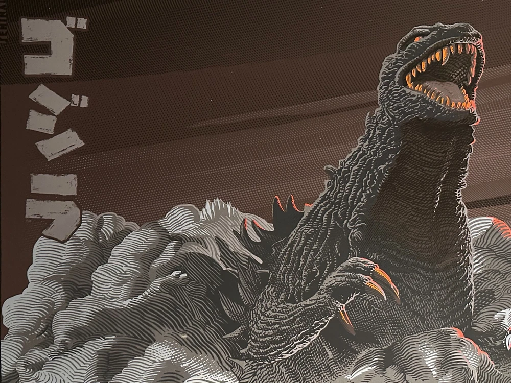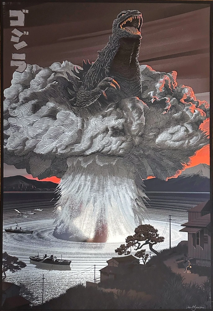 Dark Hall Mansion is pleased to bring back one of our favorite artists, Laurent Durieux, for our next officially licensed limited edition print release in the DHM Seminal Film Series, the original 1954 Japanese landmark film, “Godzilla.” Dark Hall Mansion, under license from Warner Bros Entertainment, will release one of the most influential and classic of all Sci-Fi films, “Godzilla.” First appearing in 1954, “Godzilla’s” impact and influence on worldwide culture is both inescapable and undeniable, yet it’s Laurent’s treatment of the film’s serious underpinnings that moved us in his conceptualization and rendering of something different, something serious and more resonant via his piece. Godzilla’s origin is inextricably tied to nuclear radiation and with Laurent’s depiction of Godzilla’s symbolic rise from the unmistakable shape of a nuclear blast’s mushroom cloud, the horrors of nuclear war and nuclear weapons proliferation are powerfully driven home. We were taken with Laurent’s quiet pastoral landscape that splits time via a distinct before and after moment, one that was very real and very much on the minds of Japan’s society in 1954, just nine years after the bombings of Hiroshima and Nagasaki, and one that is still very much with us and on the minds of all today. The essence of DHM’s Seminal Film Series is to showcase an artist’s work in print in a manner that is visually striking, compelling, and hopefully at times, provocative. We feel Laurent has done just that with his “Godzilla,” his pieces here not just entertain but provoke thought and consideration. His Standard edition’s color palette evocatively underscores his visual’s powerful thematics while his Variant edition has a darker intensity harkening to the film’s black and white origins, its visuals strikingly offset with only Godzilla’s name rendered via kanji. 24" x 36" regular foil edition of 125 signed by the artist printed on foil paper released August 28th 2015 mint condition The print is in excellent condition, stored flat and has never been displayed. The print will be shipped in a sturdy poster tube. Photos are of the actual prints you will receive.