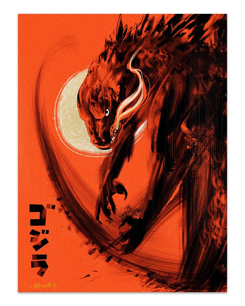 Godzilla Gojira An official, limited edition print by artist Zi Xu Edition: Limited Edition of 150 Technique: archival pigment print Dimensions: 18" x 24" Markings: hand-numbered Mint condition; stored flat in an archival sleeve. From the 1956 film Godzilla directed by Ishiro Honda, Terry Morse and starring Raymond Burr, Takashi Shimura, Momoko Kôchi.