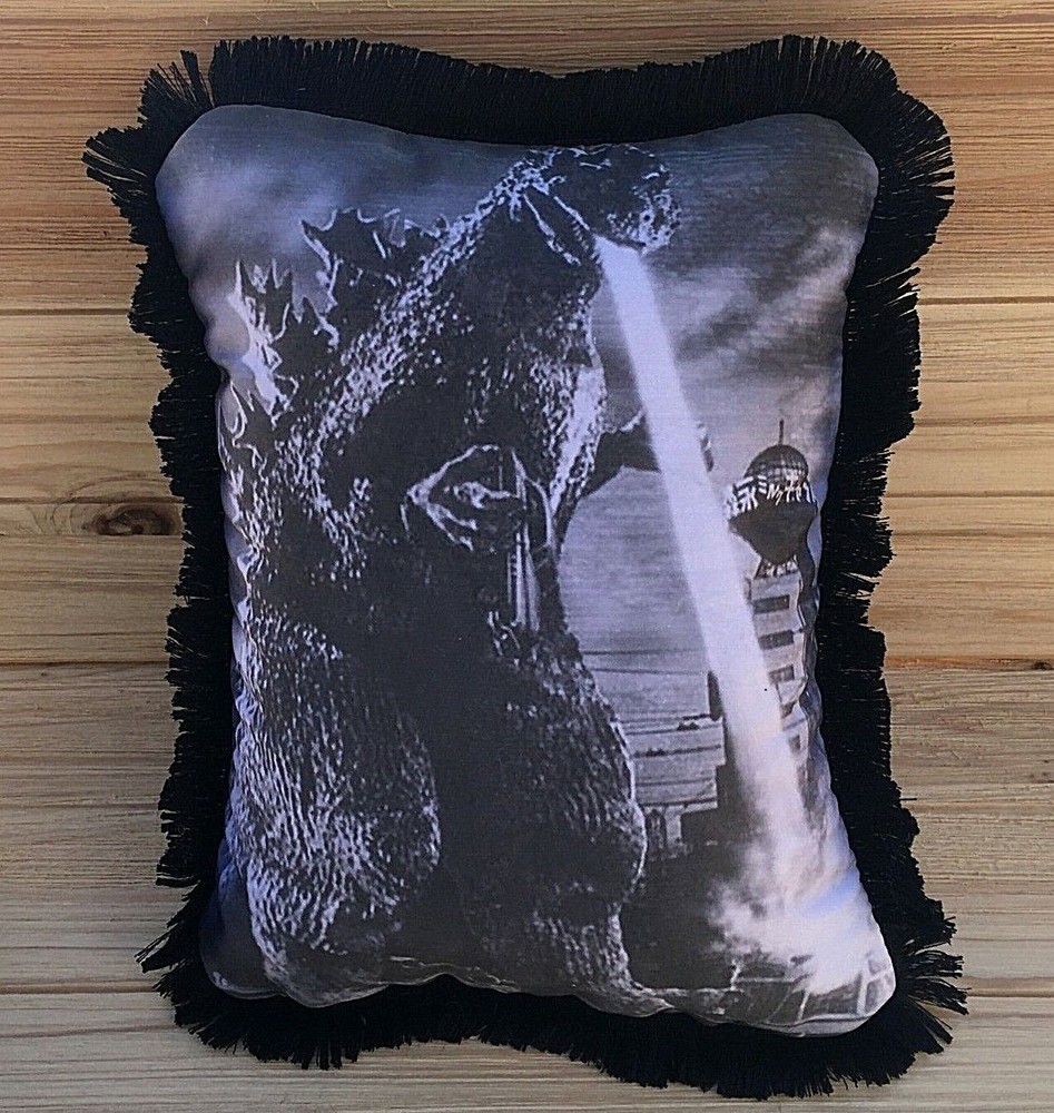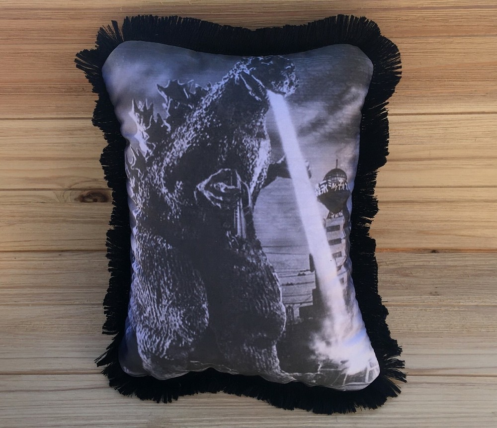 We have larger pillows now! Our handmade classic movie art accent pillows come with fluffy stuffing! Godzilla, 1954’s famous monster film, is featured in our new classic movie accent pillow. The dramatic classic photo of the “King of the Monsters” is printed on all cotton, with a soft, black velour back adorned with a single silver star, and soft black fringe all around. Comes softly stuffed with hypoallergenic polyester filling, with a hand-stitched enclosure. Smaller size accent pillows are roughly 8 1/2 by 11 inches/Larger size throw pillows are roughly 12 by 16 inches/Cotton & Polyester - spot clean.
