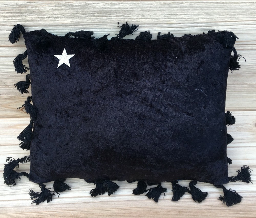 This Godzilla pillow is a must-have for any classic movie fan! The detailed print captures the iconic monster perfectly, and the soft velour back with silver star adds a stylish touch. The fluffy stuffing makes it super comfy, and the hand-stitched quality ensures durability. Love the black fringe—it gives it a cool vintage vibe. Perfect for displaying on a couch or bed!