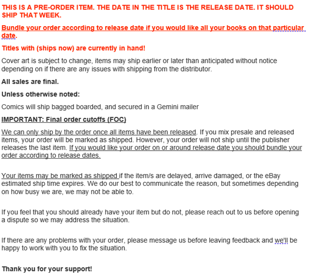 The crew made it to London, infiltrated the base, dealt with the double-crossers, and stole Mechagodzilla! Now, all they have to do is get this 200-foot mechanical monstrosity out of London…and avoid the King of the Monsters as they do it. Unfortunately for them, Godzilla is already angry, and nothing gets it worked up more than an artificial imposter. What began as a heist will end as the fight of the century. THIS IS A PRE-ORDER ITEM. THE DATE IN THE TITLE IS THE RELEASE DATE. IT SHOULD SHIP THAT WEEK. Bundle your order according to release date if you would like all your books on that particular date . Titles with (ships now) are currently in hand! Cover art is subject to change, items may ship earlier or later than anticipated without notice depending on if there are any issues with shipping from the distributor. All sales are final. Unless otherwise noted: Comics will ship bagged boarded, and secured in a Gemini mailer IMPORTANT: Final order cutoffs (FOC) We can only ship by the order once all items have been released . If you mix presale and released items, your order will be marked as shipped. However, your order will not ship until the publisher releases the last item. If you would like your order on or around release date you should bundle your order according to release dates. Your items may be marked as shipped if the item/s are delayed, arrive damaged, or the eBay estimated ship time expires. We do our best to communicate the reason, but sometimes depending on how busy we are, we may not be able to. If you feel that you should already have your item but do not, please reach out to us before opening a dispute so we may address the situation. If there are any problems with your order, please message us before leaving feedback and we'll be happy to work with you to fix the situation. Thank you for your support!