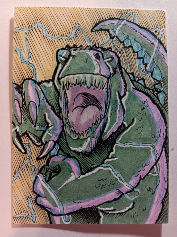 Godzilla Kaiju Sketch Card By JACS. Zilla powers up to take down his foe. Original artist sketch card. Not from a set. Drawn in Micron tech pens and markers. Shipped FREE with USPS Ground Advantage.