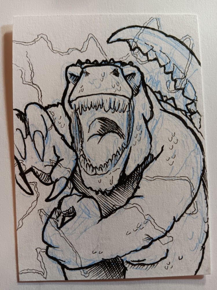 Godzilla Kaiju Sketch Card By JACS. Zilla powers up to take down his foe. Original artist sketch card. Not from a set. Drawn in Micron tech pens and markers. Shipped FREE with USPS Ground Advantage....