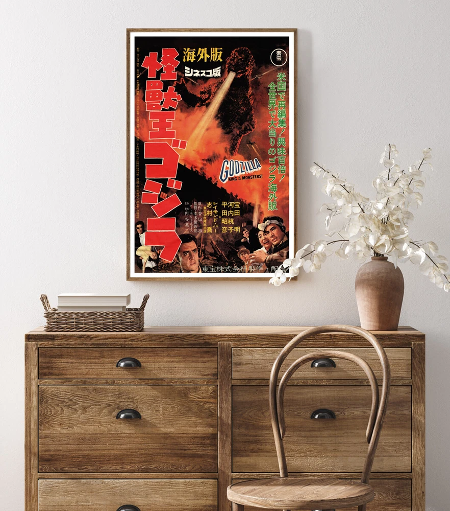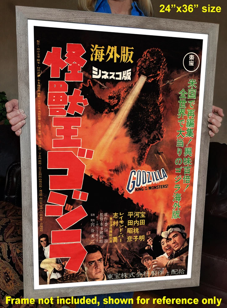 These are simply the best posters available! You will be thrilled with the image quality, vivid colors, fine paper, and unique subjects . OUR POSTERS ARE SIZED FOR STANDARD OFF-THE-SHELF FRAMES, WITH NO CUSTOM FRAMING REQUIRED, PROVIDING HUGE COST SAVINGS! This beautiful poster has been re-mastered from a 1956 movie poster for the Japanese monster/horror film “Godzilla, King of The Monsters!” This “Americanized” version of the original 1954 “Godzilla” movie included added scenes with American actor Raymond Burr. The vibrant colors and detail of this classic image have been painstakingly brought back to life to preserve a great piece of history. The high-resolution image is printed on heavy archival photo paper, on a large-format, professional giclée process printer. The poster is shipped in a rigid cardboard tube, and is ready for framing. The 24"x36" format is an excellent image size that looks great as a stand-alone piece of art, or as a grouped visual statement. This poster has a 1" white border. These posters require no cutting, trimming, or custom framing , and a wide variety of 24"x36" frames are readily available at your local craft or hobby retailer, and online. A great vintage print for your home, shop, or business! GODZILLA, KING OF THE MONSTERS! - 1956 Godzilla, King of the Monsters! (Japanese: 怪獣王ゴジラ , Hepburn: Kaijū Ō Gojira) is a 1956 kaiju film directed by Terry O. Morse and Ishirō Honda. It is a heavily re-edited American localization, commonly referred to as an "Americanization," of the 1954 Japanese film Godzilla. The film was a Japanese-American co-production, with the original footage produced by Toho, and the new footage produced by Jewell Enterprises. The film stars Raymond Burr, Frank Iwanaga, along with Akira Takarada, Momoko Kōchi, Akihiko Hirata, and Takashi Shimura, with Haruo Nakajima and Katsumi Tezuka as Godzilla. In the film, an American reporter covers a giant reptilian monster's attack on Japan. In 1955, Edmund Goldman acquired the 1954 film from Toho and enlisted the aid of Paul Schreibman, Harold Ross, Richard Kay, and Joseph E. Levine to produce a revised version for American audiences. This version dubbed most of the Japanese dialogue into English, altered and removed key plot points and themes, and added new footage with Burr narrating most of the film and interacting with body-doubles and Japanese-American actors in an attempt to make it seem like Burr was part of the original Japanese production. Godzilla, King of the Monsters! was theatrically released in the United States on April 27, 1956 and was followed by an international release. The film was responsible for introducing Godzilla to a worldwide audience, as the 1954 film remained unavailable officially overseas until 2004.