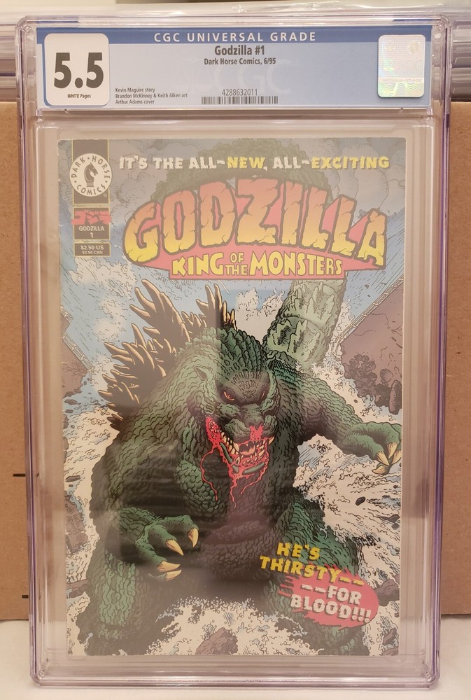 This is the ultimate collectible for fans of the 1995 Dark Horse Comics series, featuring Godzilla as the king of monsters. The comic book includes the iconic cover art by Arthur Adams and is in a 5.5 Fine- grade. The single issue is written and drawn by Kevin Maguire and Brandon McKinney, with a Color style. The Godzilla King of the Monsters #1 is a must-have for fans of US Comics, Movie & TV, Monster, Horror & Sci-Fi genres. The English language comic was published in Canada in 1995 and comes with a single unit of sale. Get your hands on this rare piece of comic book history today!