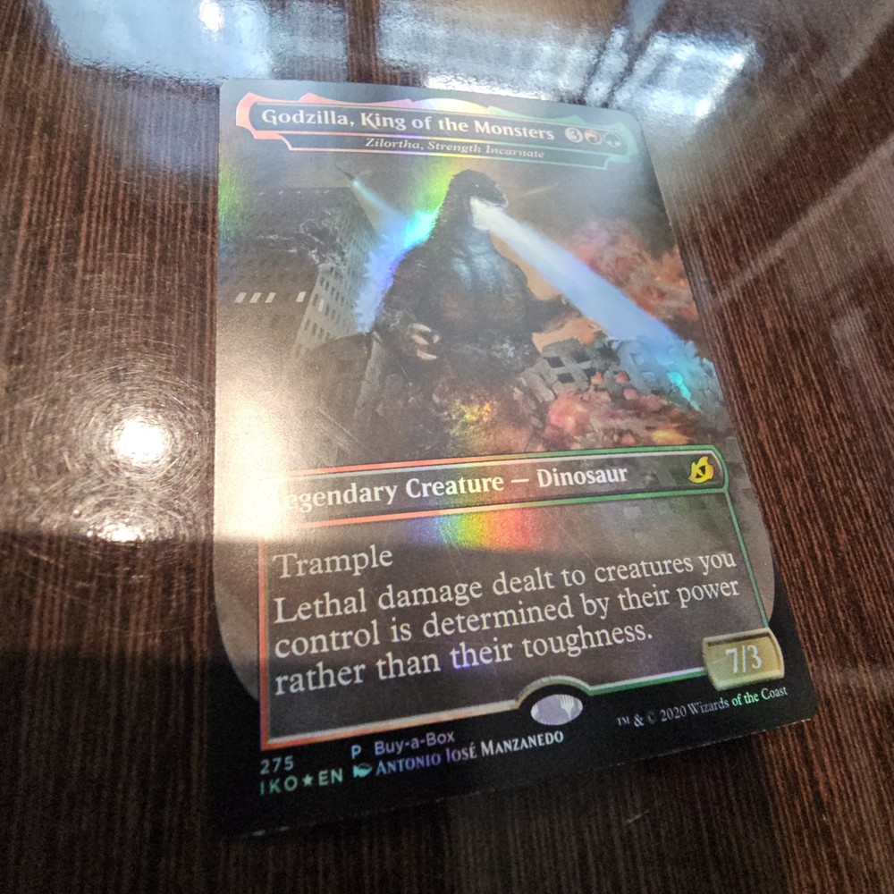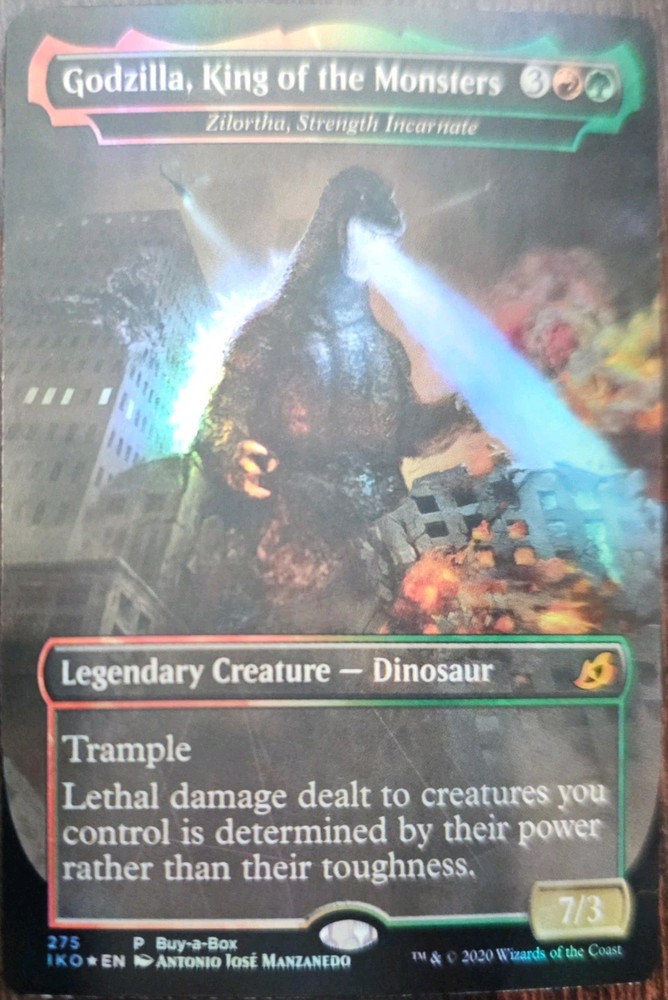 Description: Own a piece of Magic: The Gathering and Godzilla history with this stunning Godzilla, King of the Monsters promo card from the Ikoria: Lair of Behemoths (IKO) series! This exclusive Buy-a-Box promo features foil artwork of the legendary Kaiju in all its destructive glory. Features: ✔ Official Magic: The Gathering (MTG) Crossover Card ✔ Godzilla-Themed Alternate Art ✔ Buy-a-Box Promo Exclusive – Limited Edition ✔ Foil Finish – Beautiful Collector's Item Card Details: Set: Ikoria: Lair of Behemoths (IKO) – Buy-a-Box Promo Card Type: Legendary Creature – Dinosaur Rarity: Promo Exclusive Condition: (Specify: Near Mint, Light Play, etc.) Language: English Collector Number: 275/274 Perfect for collectors, MTG players, and Godzilla fans – Grab this rare card now!