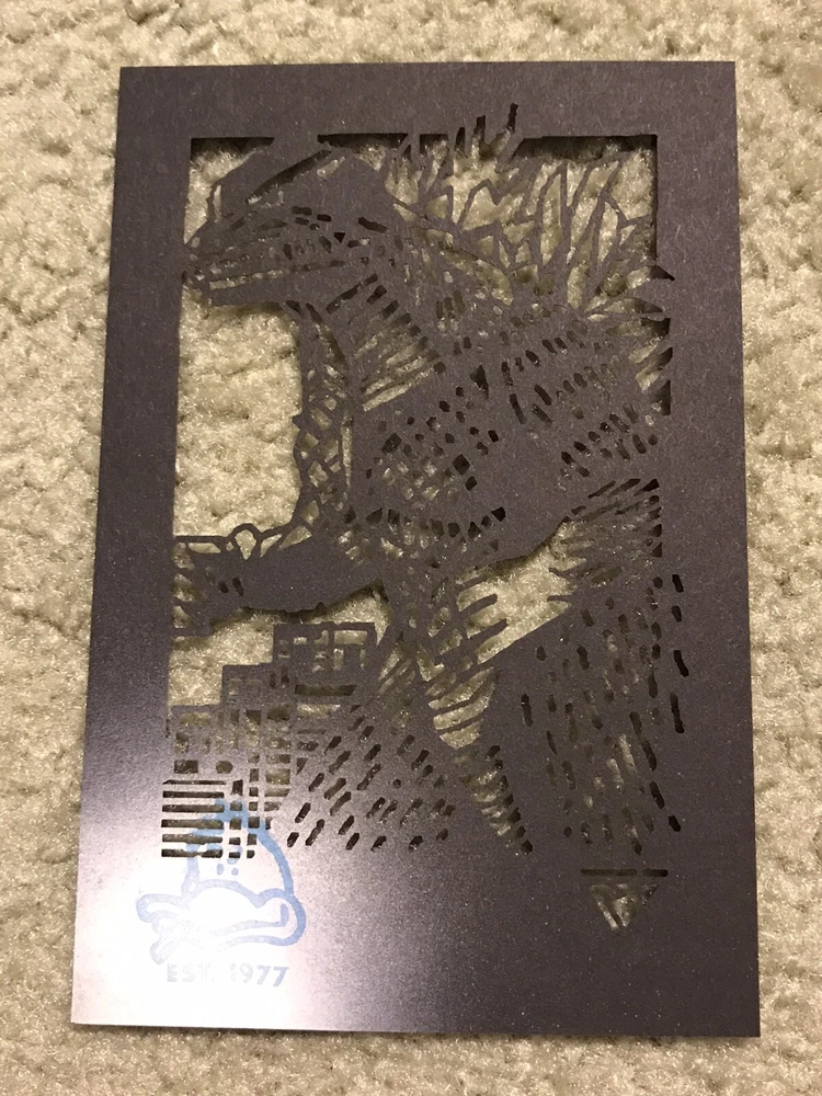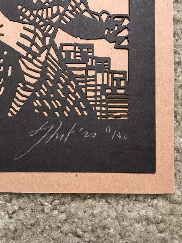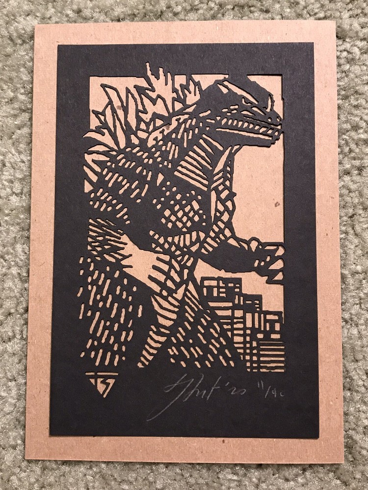 Up for sale is a “G odzilla " kolcut ( aka Radiation Burn or laser Cut) print by Tyler Stout . Size is 4" x 6". In great condition! ( see pics!) Thanks! Print will be packed with care and shipped flat. I have selling prints for many years. Check my feedback if you have any worries. Look to my other auctions for other great buys. If you have any questions about this Print feel free to ask. I have other prints up for auction!! Thank you and good luck bidding. Auction Rules 1. I only leave Feedback after its left for me ( If you have a problem with the item I'd rather come to a mutual agreement ) 2. Please only bid if your serious about it. I will not tolerate anymore non-paying buyers (if you bid on my items and do not pay I will report you to e-bay and you will receive a non-paying strike). 3. Anyone who bids on my auctions with a rating less then 95% MUST email me first or I will cancel your bid. 4...This auction is for U.S. residents with U.S. addresses only. (I'm sorry but due to the many problems I have received from dealing with international shipping I can no longer ship outside of the U.S.) 5...The faster I receive payment the faster you will receive your item or items. 6...Payment should be made no later than 48 hours after the end of the auction. 7...The prices for Shipping are for the lower 48 states (alaska and Hawaii would cost extra). 8..Please Make sure that your e-mail is valid and that theres room to receive e-mails.....I don't want my emails returned to me because you have too much mail in your inbox( I can't help you with a problem or question if I can't respond) 9. Please Read the entire auction before you bid...I am very truthful with my auctions and I list the descriptions of the items honestly 10. I Only Accept PAYPAL and PAYPAL Only!(It is safer for you and it is safer for me) I do cancel bids from people who don't comply. I'm Sorry about these rules but I have encountered a lot of trouble lately with non-paying bidders....