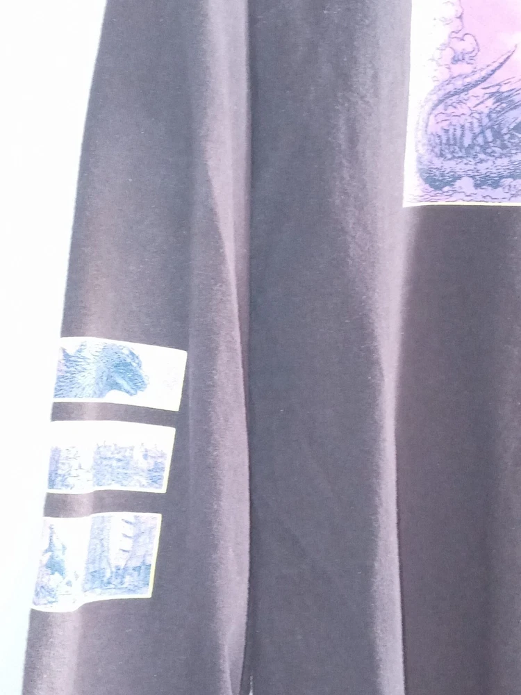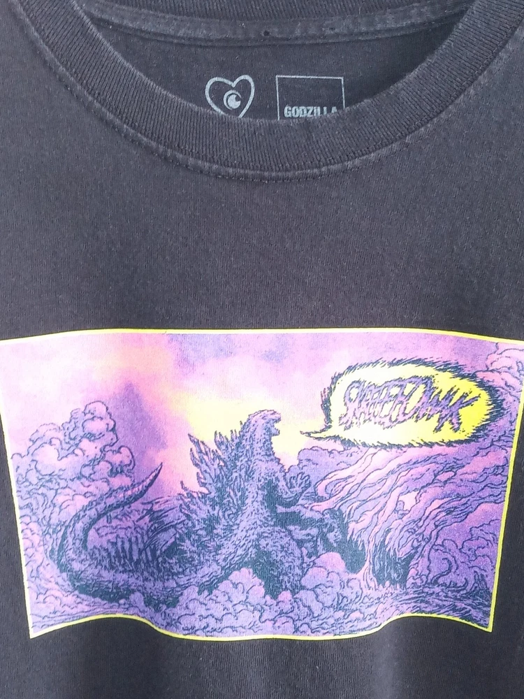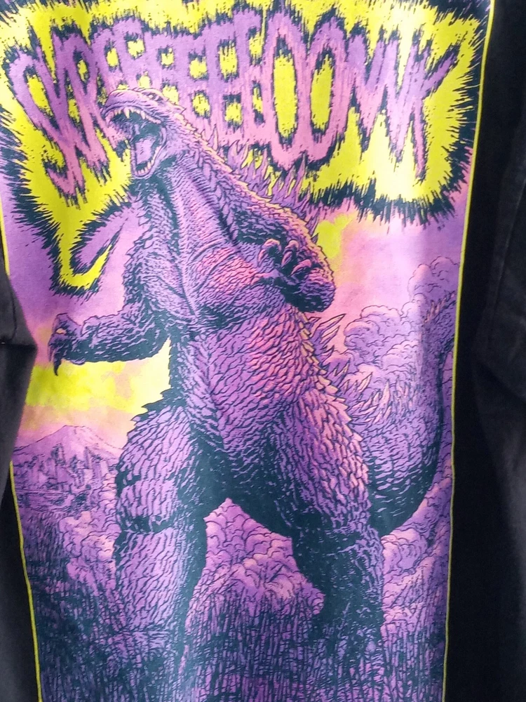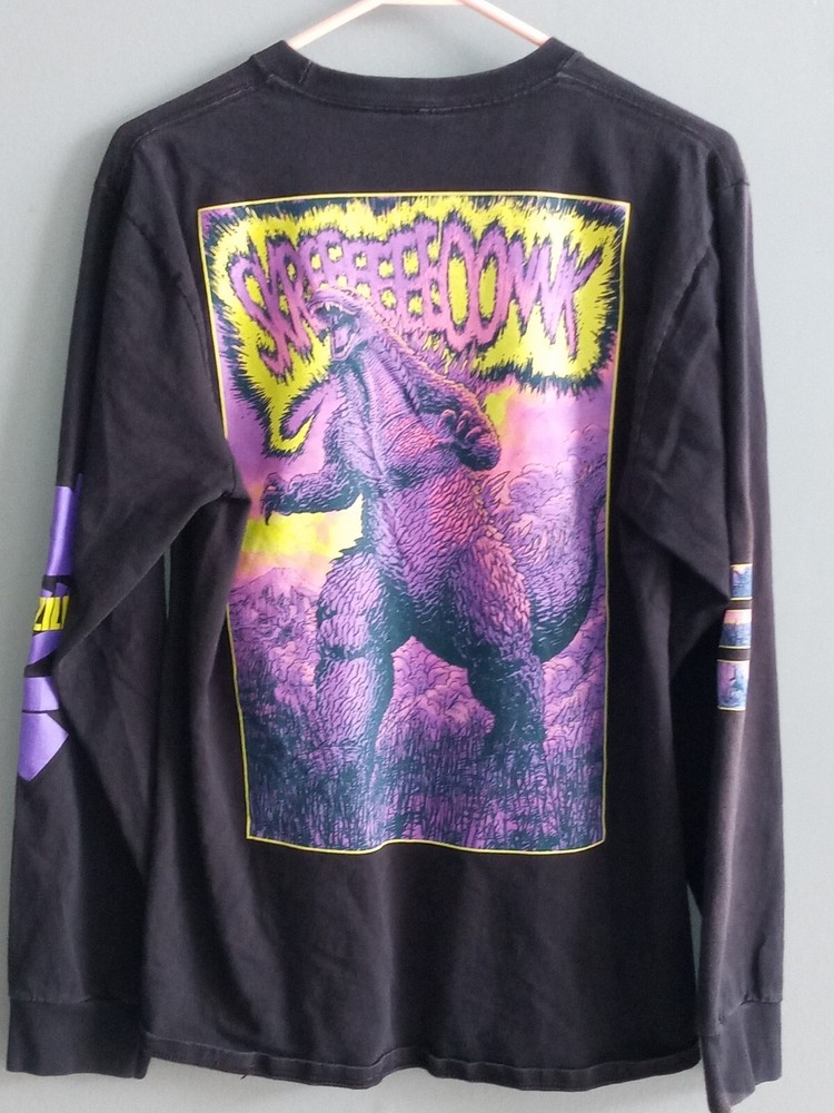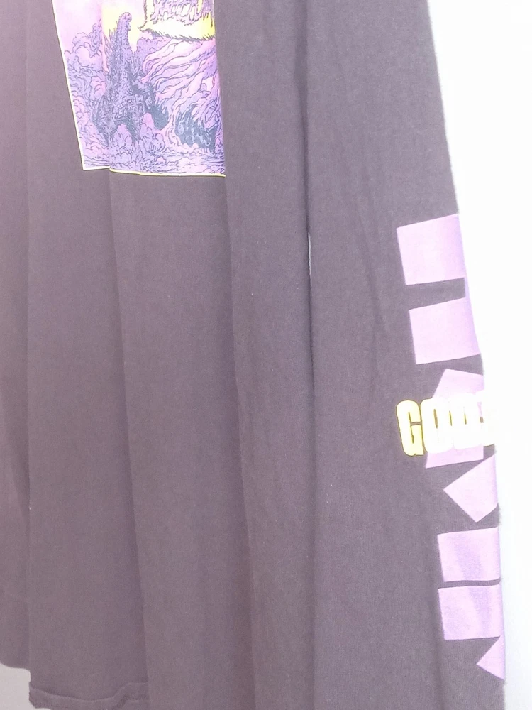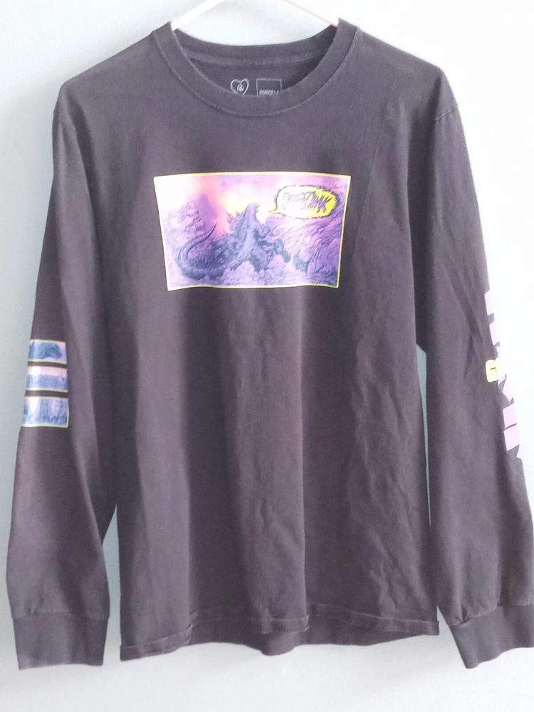 Show off your love for Godzilla with this black long sleeve T-shirt from Crunchyroll. The shirt features a graphic print of the iconic monster, with back, sleeve, and front graphics. Made of comfortable cotton material, the shirt is machine washable and perfect for summer, fall, and spring seasons. The crew neck T-shirt comes in a regular fit and size M, with no option for personalization. It's a great addition to any fan's collection, whether you're a fan of the Godzilla franchise or just love the retro 90s cartoon design. Get yours today and show off your love for Kaiju!