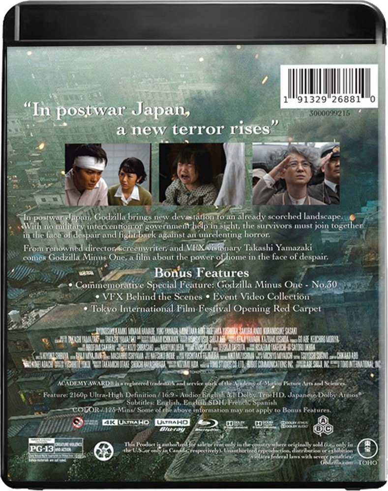 Godzilla Minus One 4K Blu-ray Toho | 2023 | 125 min | Rated PG-13 | Nov 19, 2024 Codec: HEVC / H.265 (62.89 Mbps) Resolution: Native 4K (2160p) HDR: Dolby Vision, HDR10 Aspect ratio: 2.39:1 Original aspect ratio: 2.39:1 Audio Japanese: Dolby Atmos Japanese: Dolby TrueHD 7.1 (48kHz, 24-bit) English: Dolby TrueHD 5.1 (48kHz, 24-bit) Subtitles English, English SDH, French, Spanish Discs 4K Ultra HD Blu-ray Disc Two-disc set (1 BD-100, 1 BD-50) Playback 4K Blu-ray: Region free