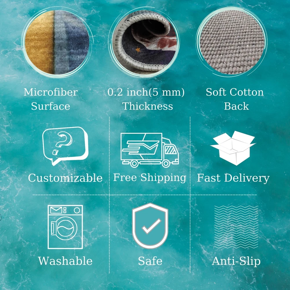 FEATURES ✔ The color of these carpets won't fade for a long time. ✔ Our Carpets consist of non-Slip Cotton Base and, Soft Shiny Microfiber Polyester fabric on the top. ✔ Our products are produced with digital printing technology. ✔ Don't wash the rug with strong chemicals and do not dry clean it. You can wash it at 30 degrees in delicate washing programs. ✔ Carpet thickness is 5 mm(0.2 inches). ✔ Rug bindings can be white or black depending on your preferences. ✔ Carpet's width or length might be ± 3% different from what you have ordered. CUSTOMIZATION To order a customized product, please send us the details about the design and dimensions. PACKAGING and SHIPMENT ✔ We send your orders by DHL, FedEx, Ups Firms by EXPRESS, ✔ It will reach any location in Europe, from 2 to 5 days. ✔ It will reach any location in the US/Canada, from 3 to 8 days. ✉ For your questions, please contact us. x429