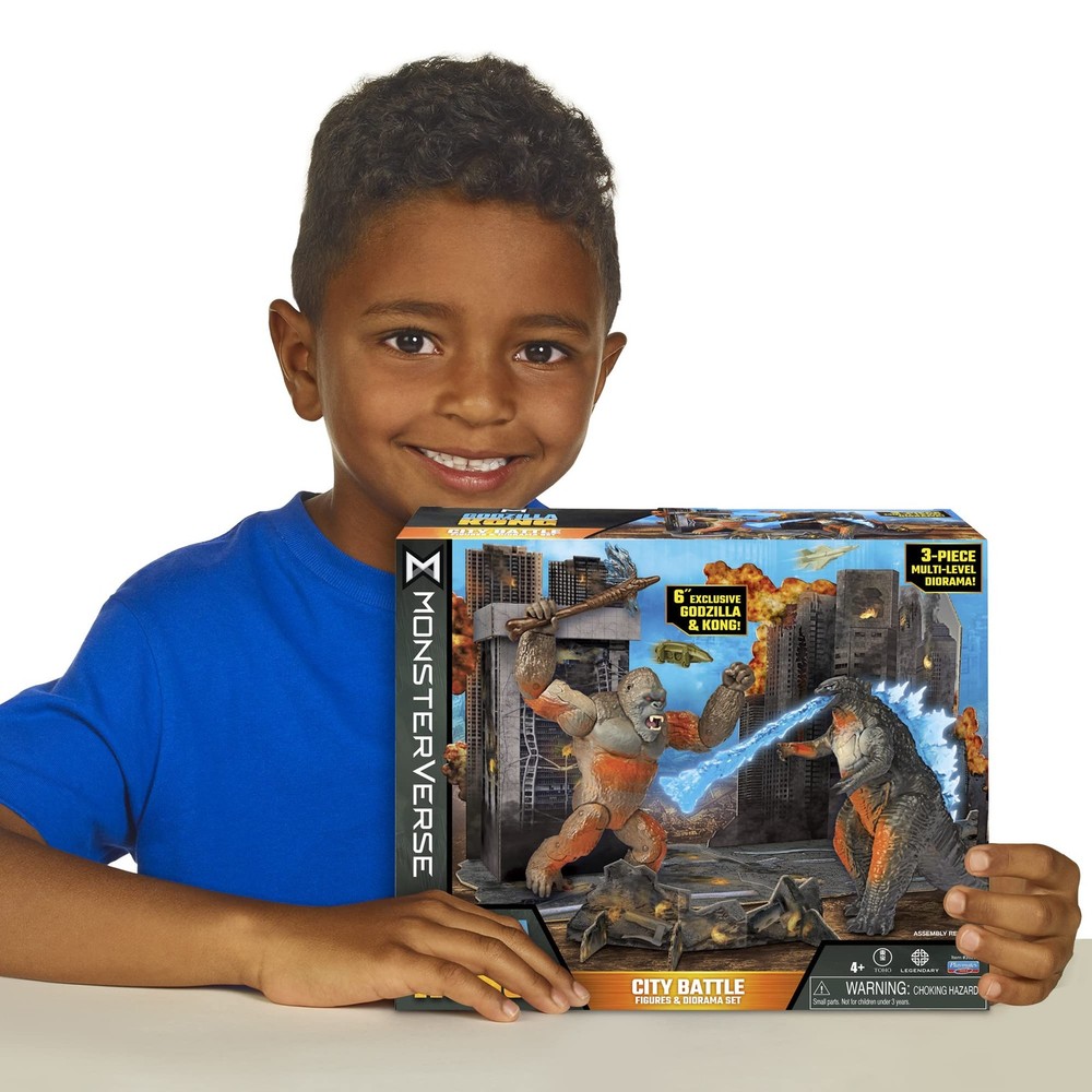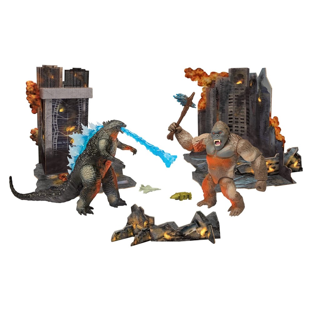 Harness the awesome power of Godzilla's thunderous roar and devastating tail-swipe as the king of the monsters battles Kong to settle an ancient rivalry! Includes Godzilla and Kong 6" figures with battle damage. Multi piece, multi level city destruction diorama to reenact the big battle between Godzilla and Kong in the 2021 Blockbuster movie. Includes Godzilla's Heat Ray, Kong's Battle Axe, HEAV Vehcile and Jet Fighter accessories!