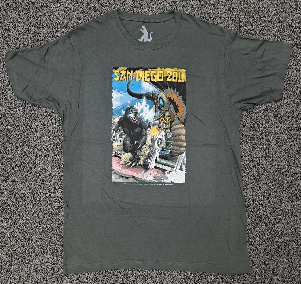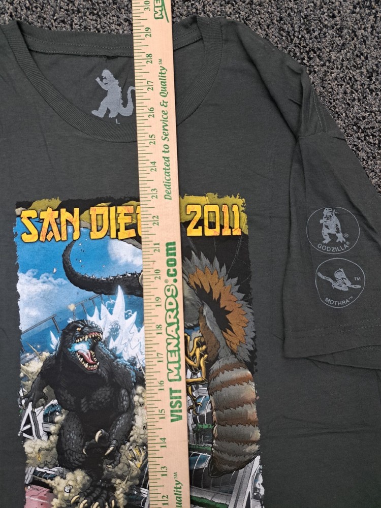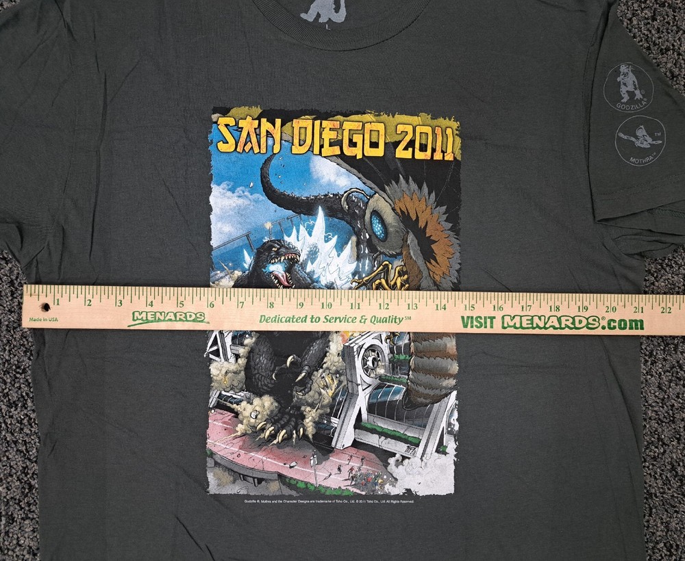 Brand New Never Worn Great Condition 2011 screen print with sleeve print Broken stitch at back of neck from tag removal See pictures. No other marks or defects Will ship in a polybag mailer and multiple orders will be shipped together Godzilla Mothra San Diego comicon 2011 Size Large Comic Art Rare