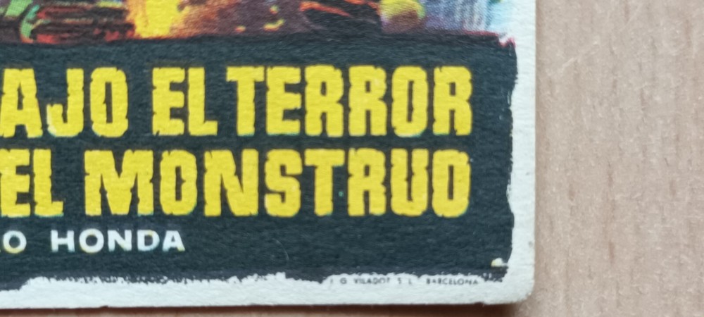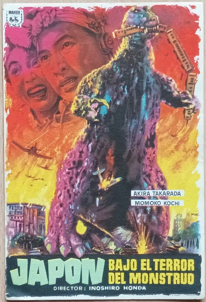 Godzilla, King Of Monsters aka: Gojira (1954) Directed by Ishiro Honda Description: Original Spanish 1956 Herald Poster Condition: Fine. Bright vivid colors Poster Year: 1956 [Spanish - Printed in Barcelona] Note that when Spanish heralds have printing on the back, we picture both sides, but when they are blank on the back, we only picture the front. Size: 3 3/4" x 5" (10 x 13 cm) Approx. Comments: A mazing artwork by MAC, Macario Gomez Condition grading: All photos displayed are of the actual item for sale. For additional photos or information on the condition of any item, please email us at Mint A never used poster. May show minor signs of age and wear at folds due to storage. No holes, no tears. Near Mint A generally unused poster with fresh, saturated colors. May have minimal tears at folds. Has no significant holes, no paper loss, may have minor tears along edges, may have fine pin holes. Fine A poster with bright colors, clean, with general signs of use. May have minor tears at folds with minor paper loss, may have fine pin holes. May have restoration. Good An average poster with overall fresh color. May have tears, minor paper loss, minor hazing. Paper may be brittle due to age, may have minor stains. May have a small amount of writing in an unobtrusive place. May have medium or major restoration . Fair A poster with faded colors and brittle paper, showing significant signs of use. May have tears and paper loss. May have tape, writing, stains in image area. In need of restoration or had major restoration. Poor A poster that is worn, torn, and/ or damaged. May have staining, cracking, dry rot, and/or large tears. May be heavily soiled, may have pieces missing. In need of major restoration.