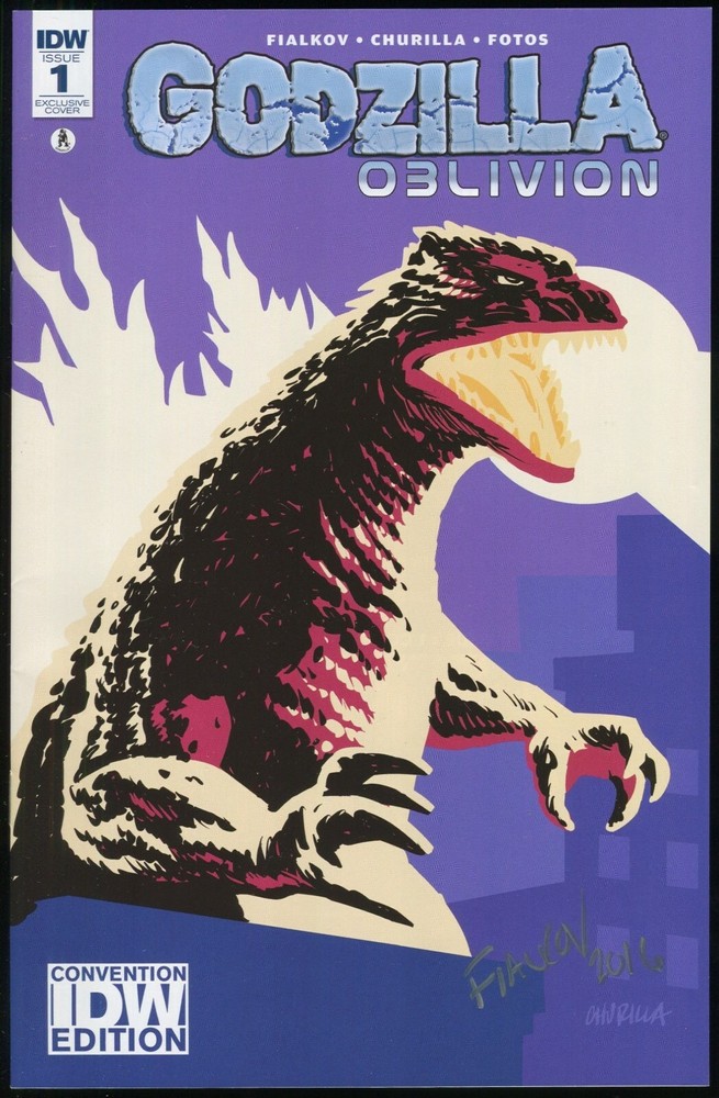 Godzilla: Oblivion #1 Signed Variant Comic Featuring the IDW Exclusive Convention Edition with Godzilla Cover Art by Brian Churilla... signed & dated by the series writer, Joshua Fialkov! Awesome!! Writer: Joshua Fialkov Artist: Brian Churilla Colorist: Jay Fotos Letterer: Chris Mowry Editor: Bobby Curnow Variant Cover by: Brian Churilla It’s the end of the world as we know it in Godzilla: Oblivion, the stunning five-part presentation from IDW Publishing. As monsters swarm from a ravaged alternative dimension to destroy the world! Battles rage across this Earth that has never known monsters, the foolhardy experiments of the scientists and the military to visit other dimensions have now doomed all civilization, can there be any possible hope of escape now? Get ready for the most epic Godzilla battle of them all!... And if that were not enough, how about a worldwide nuclear strike about to be launched!! Featuring amazing "Godzilla Cover Art" by Brian Churilla! Awesome!!! Story/Spoilers: In issue #1, In the laboratory of Dr. Eli Talbert, his assistant Ridley informs him that the interdimensional portal they had been working on is finally completed. Just then, Talbert's employer Ms. Yamada enters the laboratory and tells Talbert to turn on the portal. Talbert warns Ms. Yamada that the portal is a completely untested technology that requires further testing, but she tells him that his only job was to build the portal, and that job is now completed. Talbert activates the portal, and Ms. Yamada and her bodyguards go through, with Talbert close behind. On the other side of the portal, they find themselves in the ruins of a city. As they wander through the ruins, the bodyguards notice something fly past them and open fire at it. One bodyguard walks towards it, only for the creature to reveal itself as a tiny Rodan, who kills the bodyguard with its uranium heat beam. The group suddenly hears a voice ordering them to return to a shelter as Kiryu arrives and attacks the Rodan. As Kiryu blasts the Rodan with a laser beam, several more Rodans descend and swarm the machine. The humans start to run away, but one Rodan catches up with them. Before the Rodan can carry off one of the bodyguards, it is blasted by a soldier wielding a laser gun. The soldier and the rest of his men load Talbert, Yamada and the bodyguards onto a truck and drive away. The soldier chastises Talbert and Ms. Yamada for wandering in the area most populated by giant monsters. Talbert asks what happened to the city, only for the soldier to incredulously ask if he is kidding. Ms. Yamada explains that they are "visitors" to the city, and that their transport broke down. The soldier then explains that the giant monsters began appearing about ten years ago and terrorized the Earth, only for a much more powerful monster to appear and end their reign of terror. He orders the shades on the truck to be lowered, and shows them the monster in question: Godzilla. The soldier says that Godzilla keeps the other monsters in check and prevents them from growing to full size, and that he and his men do whatever it takes to keep Godzilla happy. Talbert tells them to turn the truck around, and one of Ms. Yamada's men holds the soldier at gunpoint. The truck drops them off, near a battle between two Rodans and two Mothra larvae. As they run back to the portal, they are pursued by a huge three-headed dragon, which a bodyguard says is called King Ghidorah by the soldiers. Talbert, Ms. Yamada and her remaining bodyguards go through the portal, but before it can close King Ghidorah travels through it as well. … story continues in issues 2,3,4,5. IDW Publishing (2016) Featuring the IDW Exclusive Convention Edition with Cover Art by Brian Churilla... signed & dated by series writer Joshua Fialkov! Awesome!! Signed Variant Comic is bagged & triple boarded and will be carefully / securely packaged then shipped via USPS Priority Mail to insure that it arrives to you perfectly and quickly. First Printing Publisher: IDW Publishing Publication Date: March 2016 Format: FC, 32 pages, Comic, 10.25" x 6.5" UPC: 827714010343 Collectible Entertainment note: Signed Variant Comic is in Very Fine + condition. Beautiful! Please See Scans!! A must have for any serious Godzilla collector / enthusiast. A fun & entertaining read! Recommended. Please read return policy. Please check out all my other "movie" listings like Gamera or Godzilla or Jurassic Park or Dinosaurs Attack or Mars Attacks or Planet of the Apes or Godzilla or Starship Troopers or Thing from Another World or Robocop or Aliens or Predator or Terminator listings by visiting my store and typing Movie or Gamera or Godzilla or Jurassic Park or Dinosaurs Attack or Mars Attacks or Planet of the Apes or Godzilla or Starship Troopers or Thing or Robocop or Aliens or Predator or Terminator in the store search engine. Track Page Views With Auctiva's FREE Counter