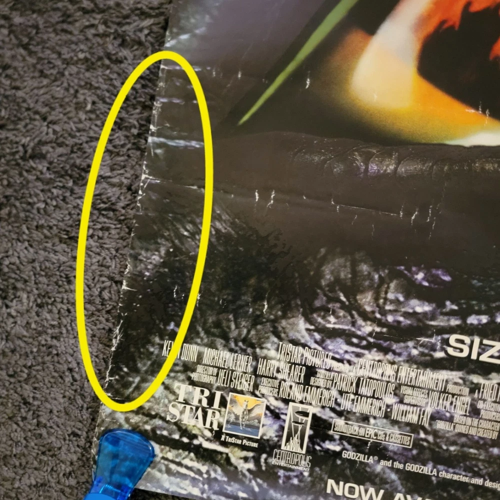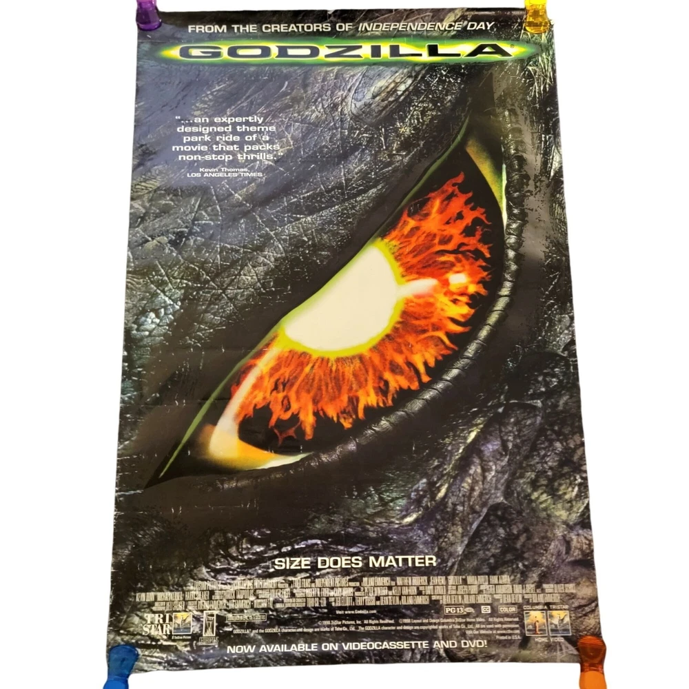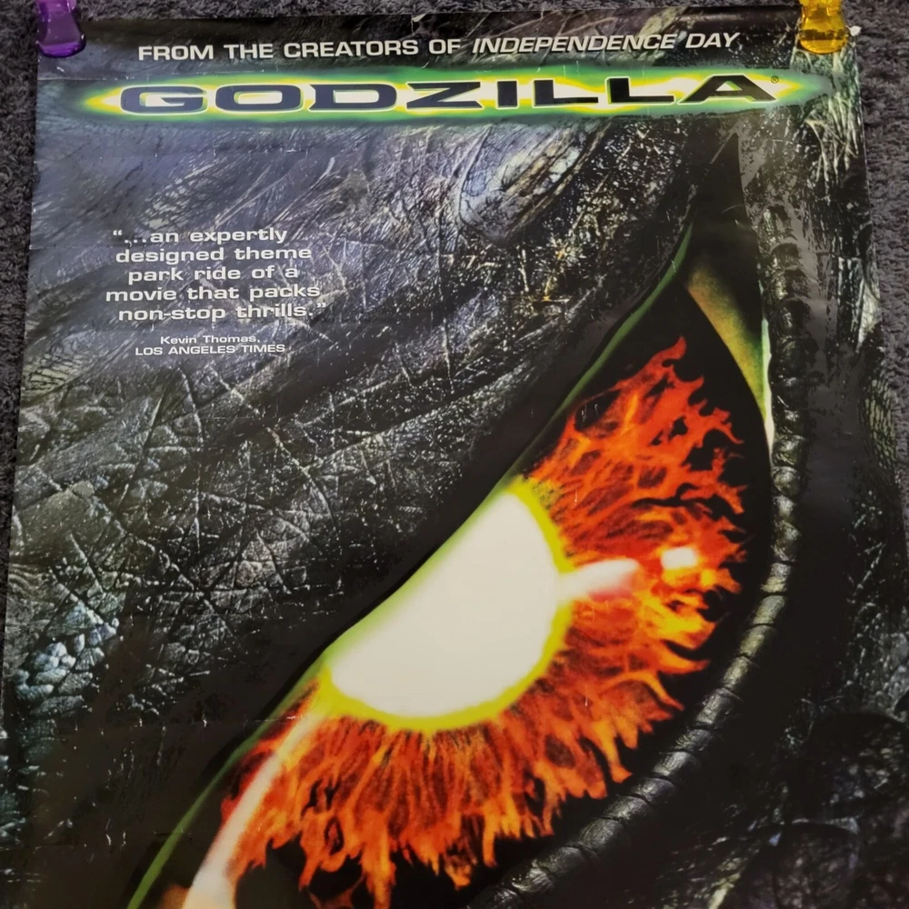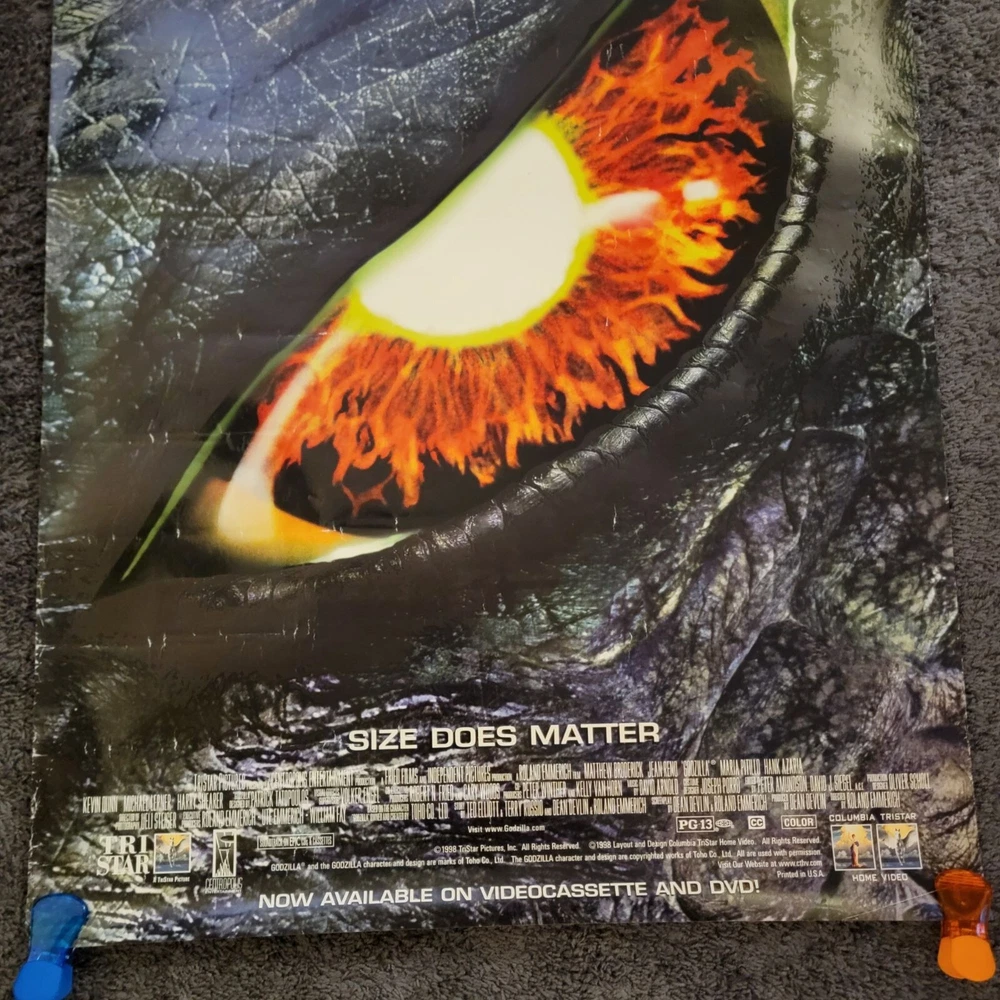 MOVIE STORE POSTER MOVIE: Godzilla YEAR: 1998 GENRE: Action, Sci-Fi, Thriller - Starring Matthew Broderick, Hank Azaria * THIS POSTER IS TEXTURED SIZE: 27" x 40" CONDITION: GOOD VINTAGE USED * Sides have marks & bends, no holes or large rips *I got these when my local movie store closed down, they are the original movie promo posters used by movie store Vintage 90s Home Decor Movie Studio Ad Room Art Print Sci-Fi Thriller Action Film Man Cave Cinema Theater