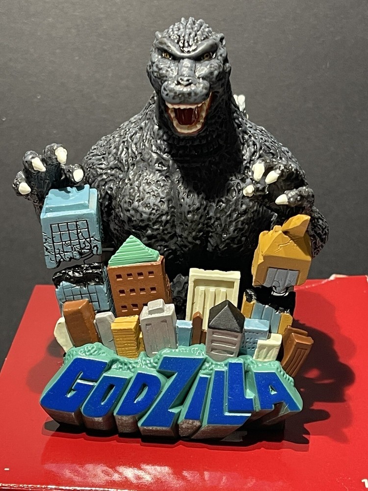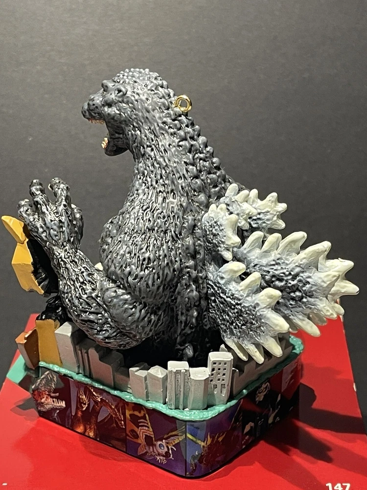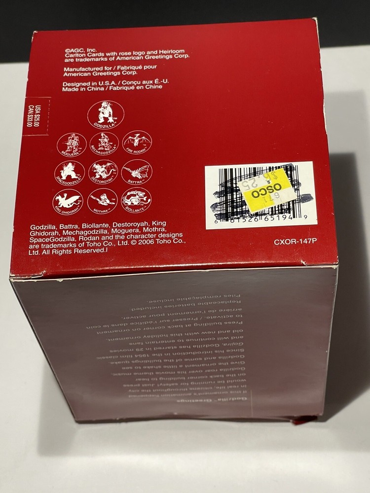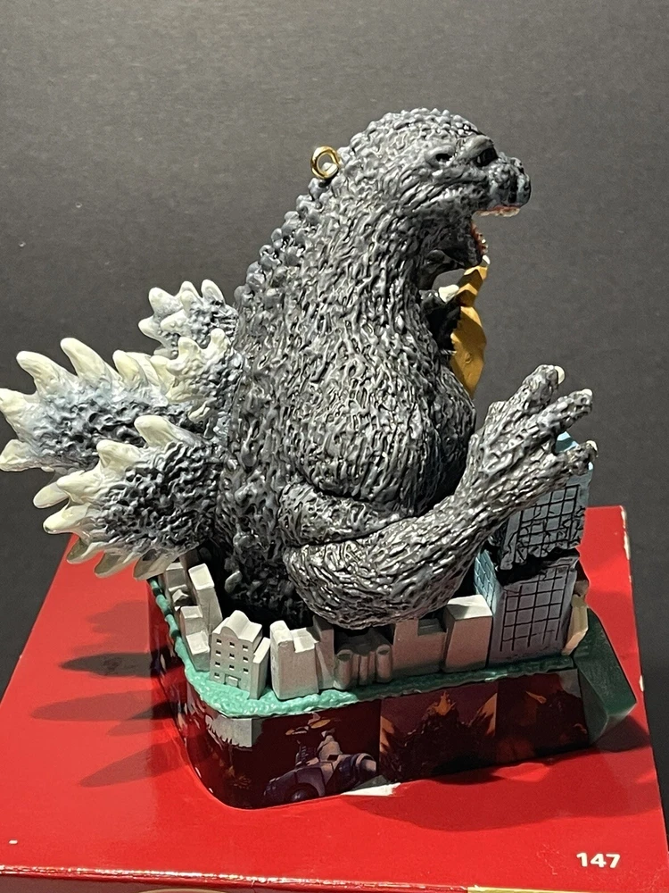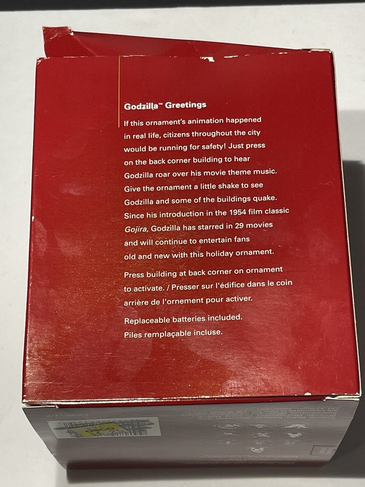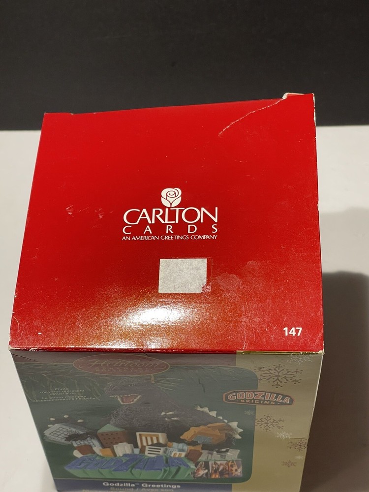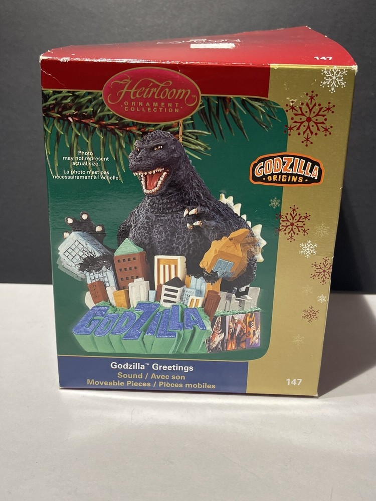 Godzilla Greetings Carlton Heirloom Christmas Ornament Sound 2006 #147 *VIDEO*. Preowned Godzilla Greetings ornament. Box shows some wear, see photos. Plays the Godzilla then when you touch button in back corner. Godzilla and the building are both in springs do they “shake”. Very cute!