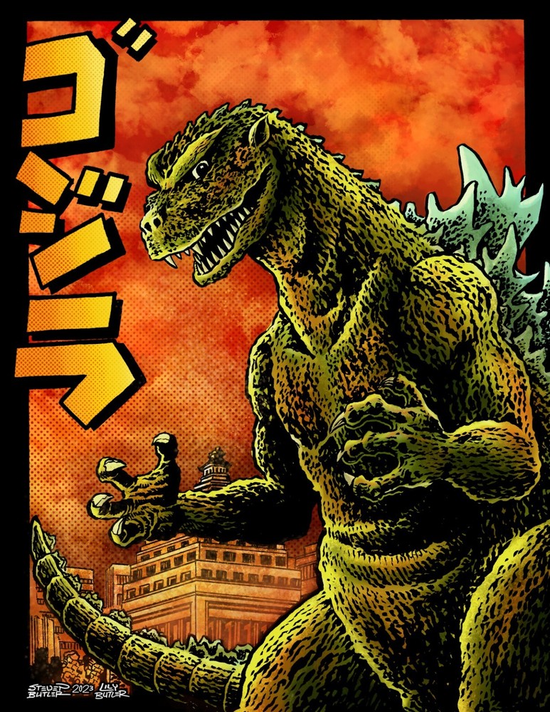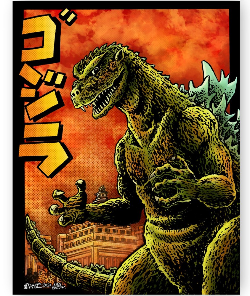 8.5" x 11" art print on 110 lb paper of Godzilla in his original form as portrayed in the 1956 film Godzilla, King of the Monsters . Piece drawn on paper and inked digitally by artist Steven Butler. Colored digitally by artist Lily Butler.