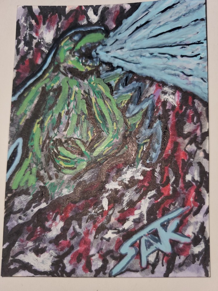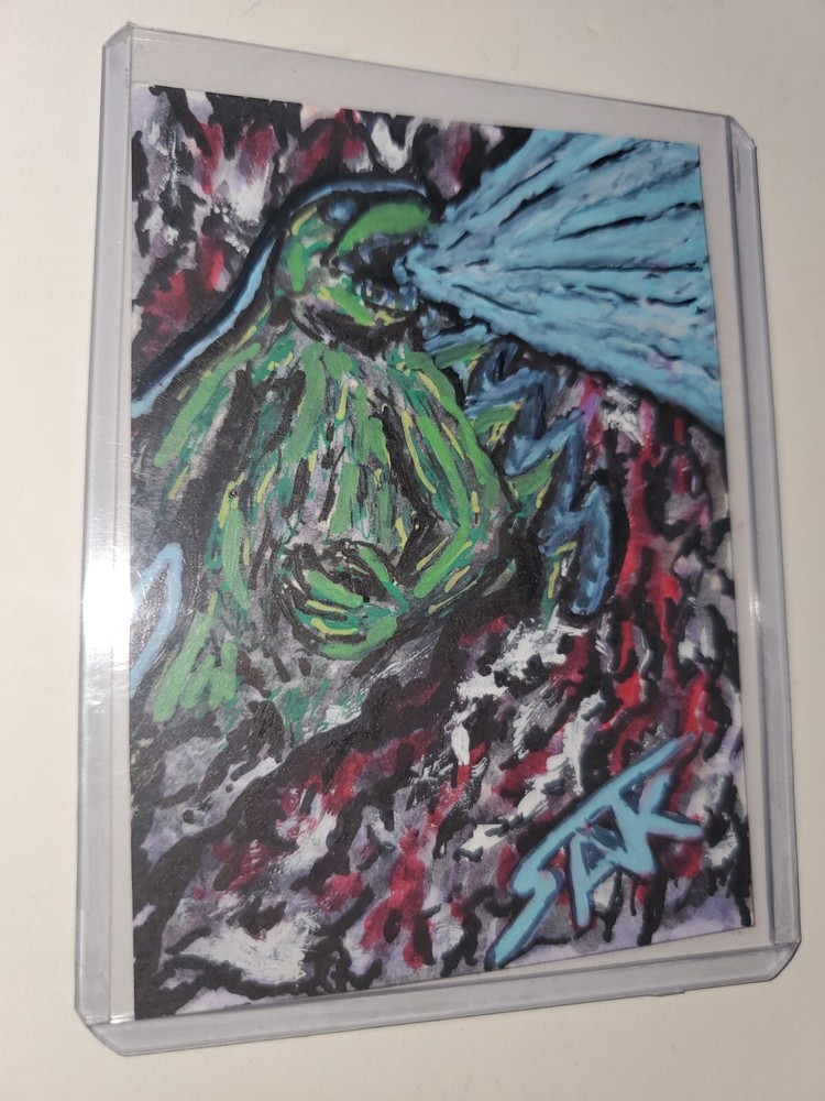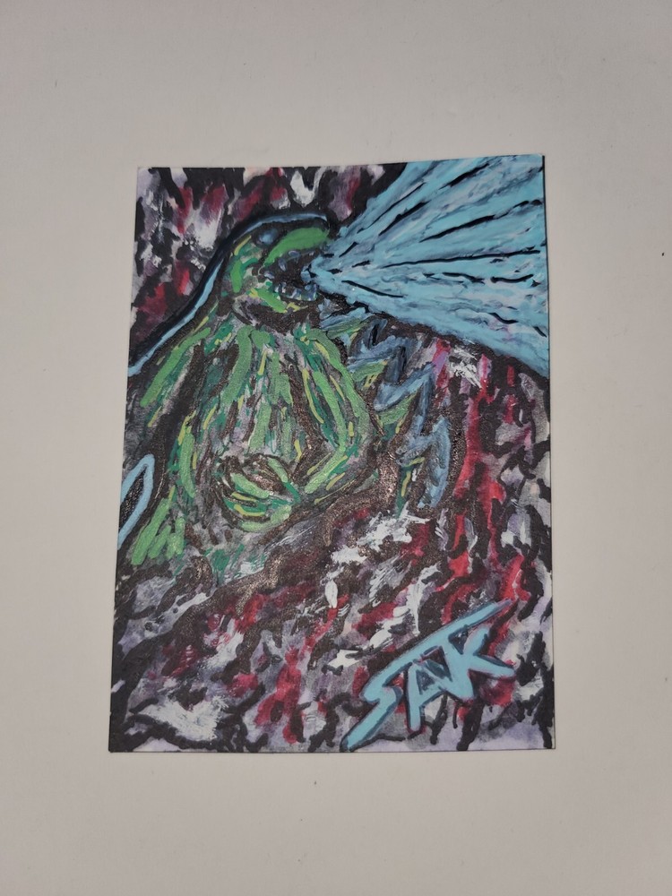 Godzilla in my own Pop visualization I really enjoyed creating this one. I love blending Ink Wash, Acrylis and Marker on Bristol Board. Hope it finds a home with someone that enjoys it. This unique Godzilla sketchcard is a one-of-a-kind piece of original art on 100 lb Bristol. Created by artist Nick Sakalis, this illustration showcases his talent for capturing the essence of this iconic cartoon character. Measuring 2.5 x 3.5 inches, this card is signed by the artist and comes in a top loader for protection. The piece is perfect for any fan of nostalgia pop culture art or people into this psychedelic view of Godzilla. The marker and brush production technique adds depth to the artwork. This item is a single piece and is handmade in the United States. Don't miss your chance to own this rare and special piece of art. This peice should considered Fan Art and I will not make any prints of it. It will stay a One of One