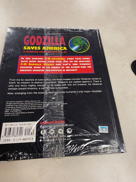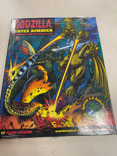 Godzilla Saves America A Monster Showdown in 3-D book. No damage to the book. Still in shrink wrap. Special 3-D Glasses should be inside. In a way I wish this book wasn't wrapped so I can see it.