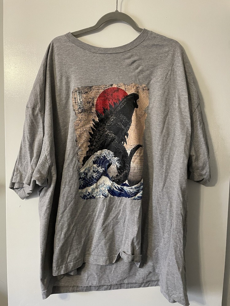 This Japanese grey Hanes T-shirt is the perfect addition to any Godzilla fan's wardrobe. The shirt features a stunning anime graphic of the iconic movie monster, Godzilla, in the form of a wave. The shirt is made of high-quality materials and is designed to fit regular size men. The shirt has short sleeves, a crew neckline, and is available in size 4XL. The shirt's grey color makes it a versatile piece of clothing that can be paired with any bottoms. This T-shirt is perfect for anyone who loves movies, art, and anime. It is a great way to show off your love for Godzilla without compromising on style. This shirt is perfect for casual outings, parties, and even for work. Get your hands on this Hanes T-shirt today and add a touch of uniqueness to your wardrobe.