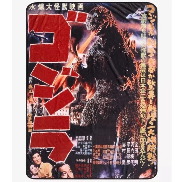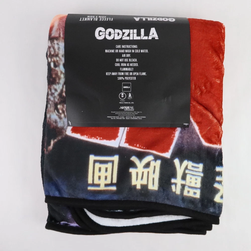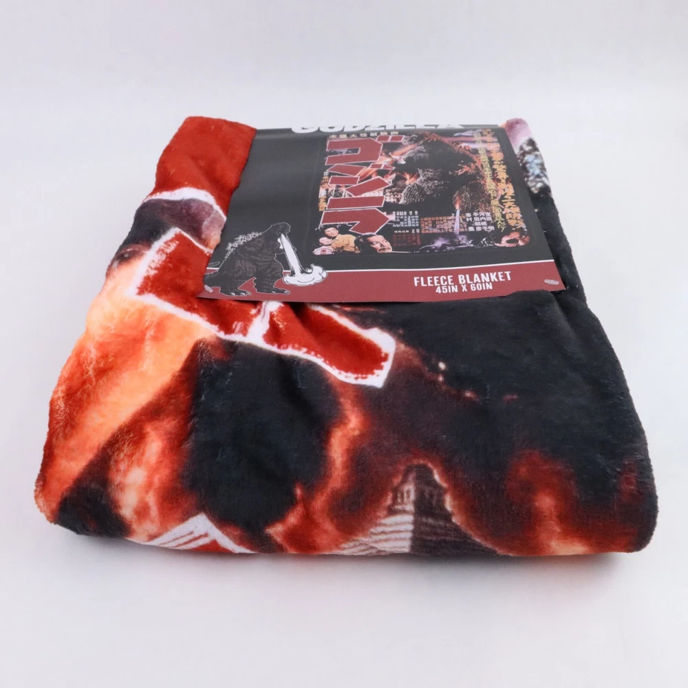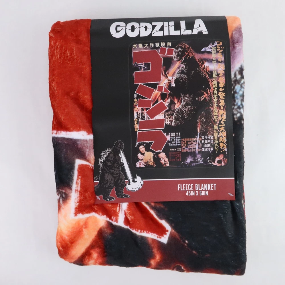 Godzilla Throw Blanket 1954 Movie Poster 45x60in Kaiju Monster Japanese Wall Art Cuddle up to watch your favorite kaiju wreak havoc again! This throw blanket features a retro Japanese poster print of the classic 1954 Godzilla film. 45" x 60" 100% polyester Wash cold; dry low
