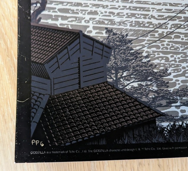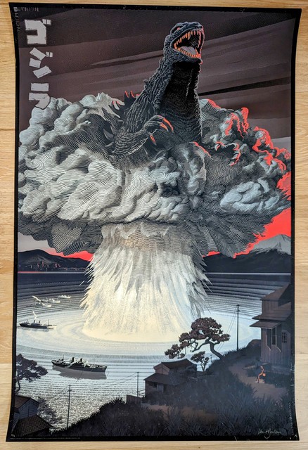 Godzilla Variant FOIL by Laurent Durieux SIGNED Ltd Edition Print Mondo Movie Godzilla Variant Foil S&D by Laurent Durieux DESCRIPTION Film: Godzilla (1956) Artist: Laurent Durieux Technique: Screen Print Dimensions: 24" x 36" Edition: Limited Edition of PP Markings: Signed and Numbered by the Artist Condition: *This print has some scuffing along the edges - see photos. Fortunately, much of this will frame out, but the price has been reduced as a result. FURTHER INFO This print is Signed and Numbered by the Artist from an edition of only PP. Guaranteed to be authentic. Based off the 1956 movie Godzilla, directed by Ishiro Honda, Terry Morse and starring Raymond Burr, Takashi Shimura, Momoko Kôchi. Genre: Action, Horror, Science Fiction About SCENEPRINTS CONDITION / AUTHENTICITY We are proud to ship worldwide! All orders include tracking and insurance. Prints will be shipped in a thick tube with acid-free tissue paper and kraft paper. We take the utmost care in handling, packaging, and shipping our art. Be assured that any issues resulting from shipping will be covered by Sceneprints. SHIPPING Guaranteed to be authentic / original artworks. Prints are in mint condition unless noted otherwise (any damage will be carefully documented and described in the listing). Prints are stored flat in acid-free archival sleeves, in a smoke-free, climate controlled environment away from direct sunlight. Further info about our process can be found on our site. ABOUT SCENEPRINTS We offer a collection of rare, limited edition prints featuring popular movies, music, fine art, and more. Art is our passion and we are excited to showcase our collection and provide you with the chance to adorn your walls with some of the greatest artwork available today! Check out our collection of works from artists such as Tyler Stout, Olly Moss, Laurent Durieux, Kilian Eng, Emek, Gabz, Chuck Sperry, Tomer Hanuka, Rory Kurtz, and more. Check out the FAQ on our site for more info! Godzilla Variant Foil S&D by Laurent Durieux DESCRIPTION Film: Godzilla (1956) Artist: Laurent Durieux Technique: Screen Print Dimensions: 24" x 36" Edition: Limited Edition of PP Markings: Signed and Numbered by the Artist Condition: *This print has some scuffing along the edges - see photos. Fortunately, much of this will frame out, but the price has been reduced as a result. FURTHER INFO This print is Signed and Numbered by the Artist from an edition of only PP. Guaranteed to be authentic. Based off the 1956 movie Godzilla, directed by Ishiro Honda, Terry Morse and starring Raymond Burr, Takashi Shimura, Momoko Kôchi. Genre: Action, Horror, Science Fiction About SCENEPRINTS CONDITION / AUTHENTICITY We are proud to ship worldwide! All orders include tracking and insurance. Prints will be shipped in a thick tube with acid-free tissue paper and kraft paper. We take the utmost care in handling, packaging, and shipping our art. Be assured that any issues resulting from shipping will be covered by Sceneprints. SHIPPING Guaranteed to be authentic / original artworks. Prints are in mint condition unless noted otherwise (any damage will be carefully documented and described in the listing). Prints are stored flat in acid-free archival sleeves, in a smoke-free, climate controlled environment away from direct sunlight. Further info about our process can be found on our site. ABOUT SCENEPRINTS We offer a collection of rare, limited edition prints featuring popular movies, music, fine art, and more. Art is our passion and we are excited to showcase our collection and provide you with the chance to adorn your walls with some of the greatest artwork available today! Check out our collection of works from artists such as Tyler Stout, Olly Moss, Laurent Durieux, Kilian Eng, Emek, Gabz, Chuck Sperry, Tomer Hanuka, Rory Kurtz, and more. Check out the FAQ on our site for more info!