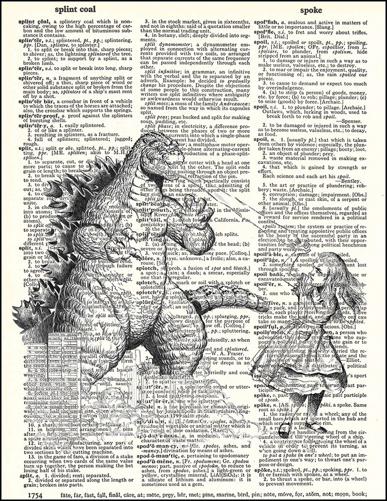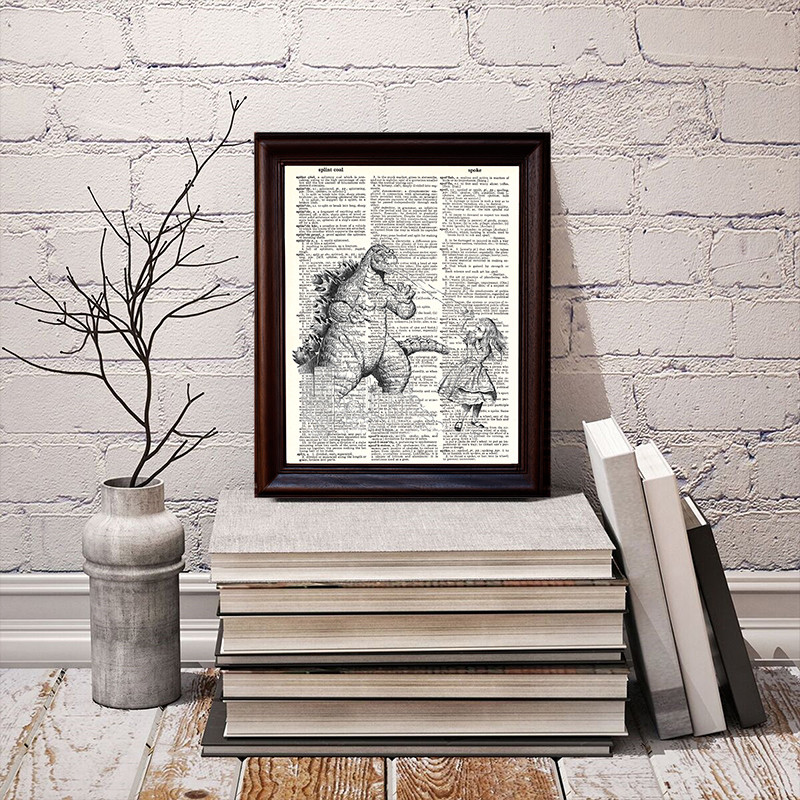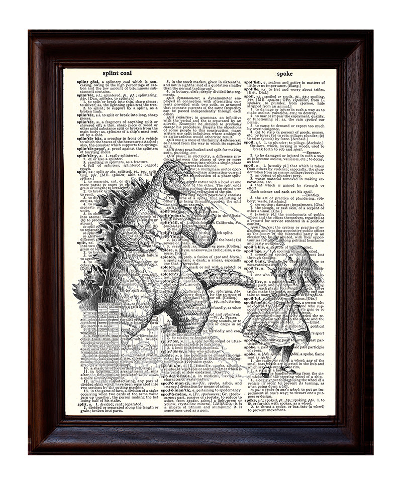 Our eBay Store Add to Favorite Sellers Godzilla Vs Alice - Dictionary Art Print Printed On Authentic Vintage Dictionary Book Page - 8 x 10.5 $11.99 This Godzilla Vs Alice design is printed on beautiful vintage dictionary paper. These prints are definitely a conversation starter and look fabulous as a wall hanging. Each design is carefully selected and then printed on vintage dictionary paper giving it that beautiful golden color that only comes from age. Since we use real book pages some unevenness or spotting occurs, this only adds another layer to the print, making each one truly unique. Dimensions are approximately 8" W x 10.5" L. *** Frames are not included.*** At Fresh Prints of CT we stand behind our goods and services and want you to be satisfied with them. If you are not satisfied with your purchase for any reason, please let us know so we can take care of you. You may return new, unopened items within 30 days.The customer is responsible for return shipping on items that are no longer wanted or needed. If you received a damaged or defective item, we’ll ship you a replacement of the exact item at no additional cost to you.