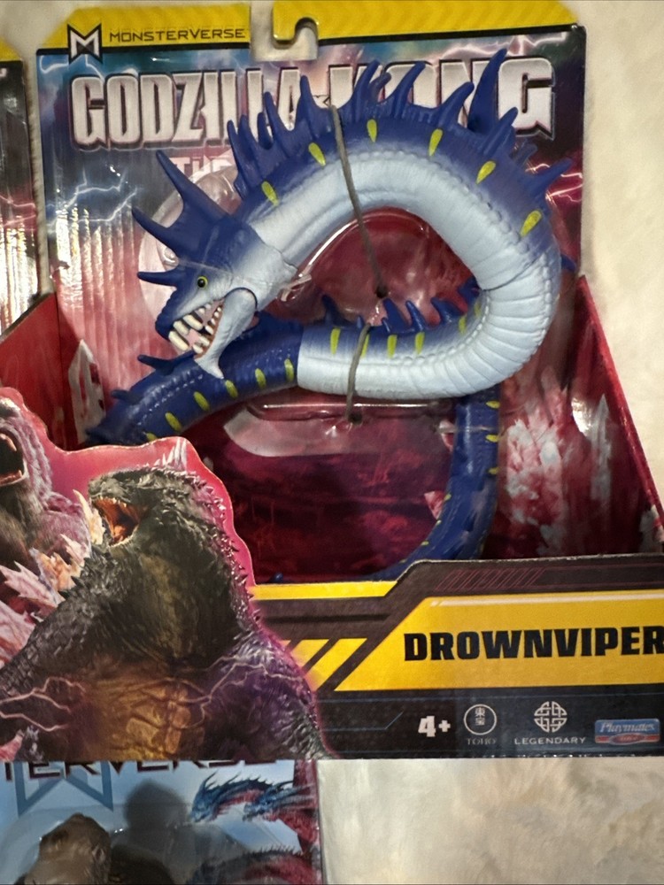 The product is a set of three action figures from the Godzilla X Kong New Empire series, featuring characters such as Suko, Titanus Doug, Drownviper, and One-Eye. These figures are made of plastic and are part of the Monsterverse Godzilla X Kong New Empire collection. They are based on the Godzilla vs. Kong movie and TV show, with a colorful multicolor design and a 1:12 scale. The figures are manufactured in 2023 by Playmates Toys, and are suitable for ages 4 and up. This mixed lot of action figures would be a great addition for fans of the Godzilla franchise.