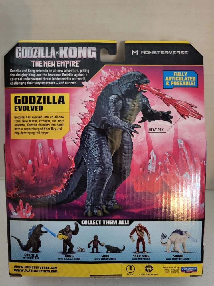 This is a limited edition, fully jointed action figure of Godzilla from the movie "Godzilla X Kong: The New Empire". The figure is made of ABS plastic and stands at 8 inches tall with an adjustable heat ray feature. . The product is part of the Playmates Toys brand and is recommended for ages 8-11 years. The figure is based on the character Godzilla and is part of the Monsterverse franchise.