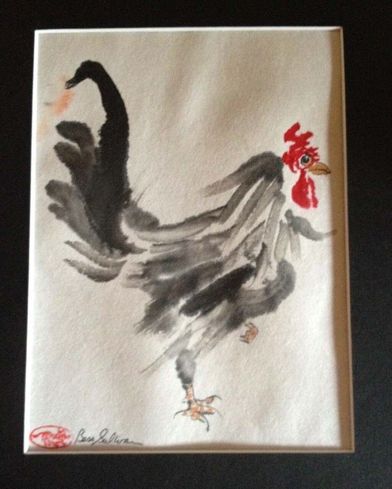 Godzilla the rooster, chickens, art print from original by E. C. Sullivan, Chinese ink on rice paper. Condition is New with tags. Shipped with USPS Priority Mail. The original is Chinese watercolor on rice paper. The print is 8x10 and comes to you matted to size 11x14, for easy framing - this is a standard frame size. I will be happy to personalize it in any way you wish. Or accept a commission for an original in a size that suits your space (costs more). Or I could paint your rooster(s). Of course, any new painting will not be exactly the same as this print, but I'd be happy to paint for you. The original of this painting is also available. This print is sold by the artist.