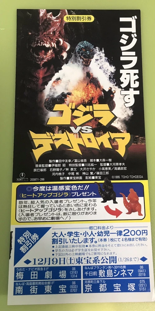 Godzilla vs. Destoroyah (1995) / Movie Discount Ticket Japan This is original discount ticket that was actually issued in Japan (1995). If we gave this discounted ticket to the theater, we got a discount (yen200) on the viewing fee. Notice: We will always block any buyer who abuses the eBay Buyer Protection system. Even if the blocked buyer creates a new ID, you won't do business again. We only deal with buyers who enjoy our collections. S/H is $7.99 (Combined shipping :Buyers have to add $ 1.00 for each additional 1stub.) Enjoy auction !