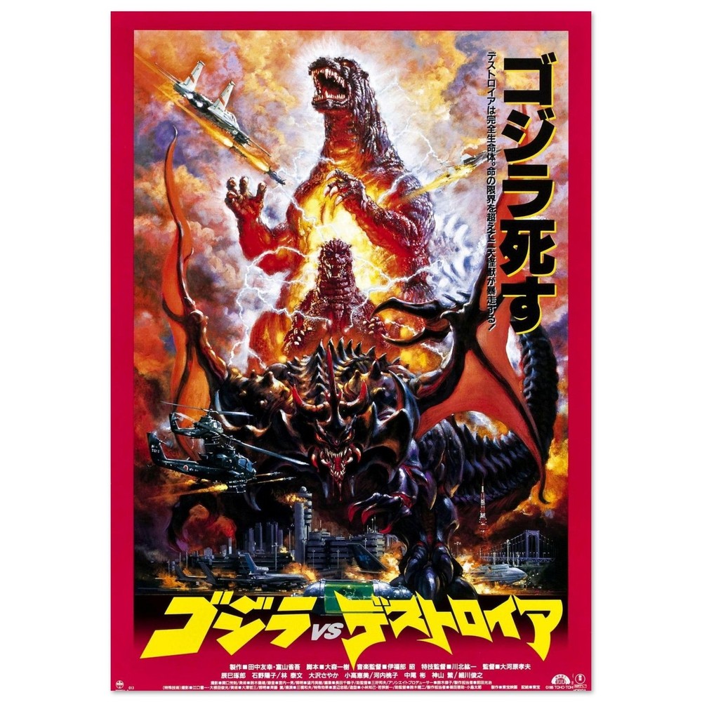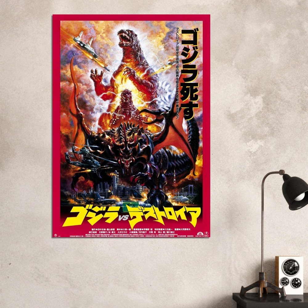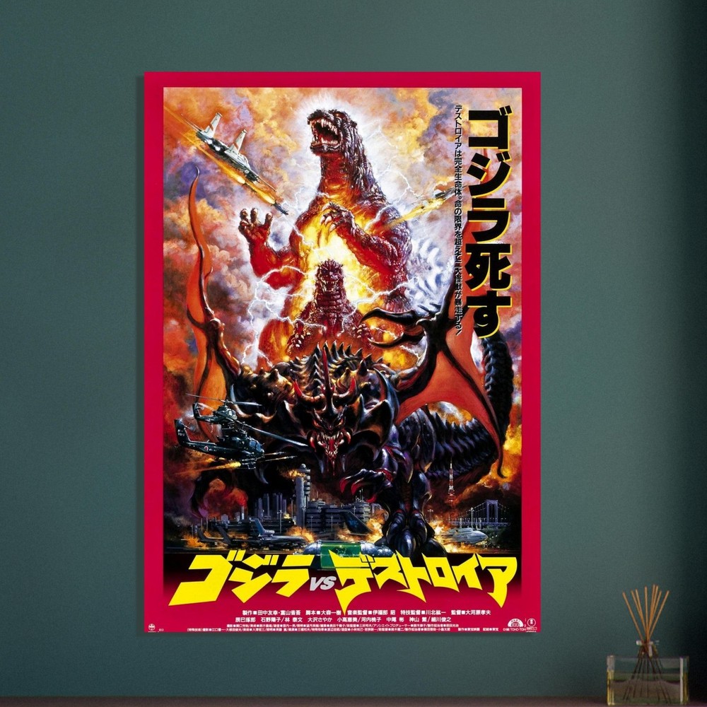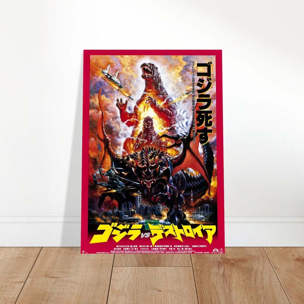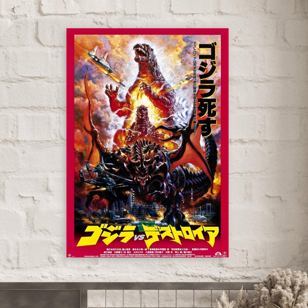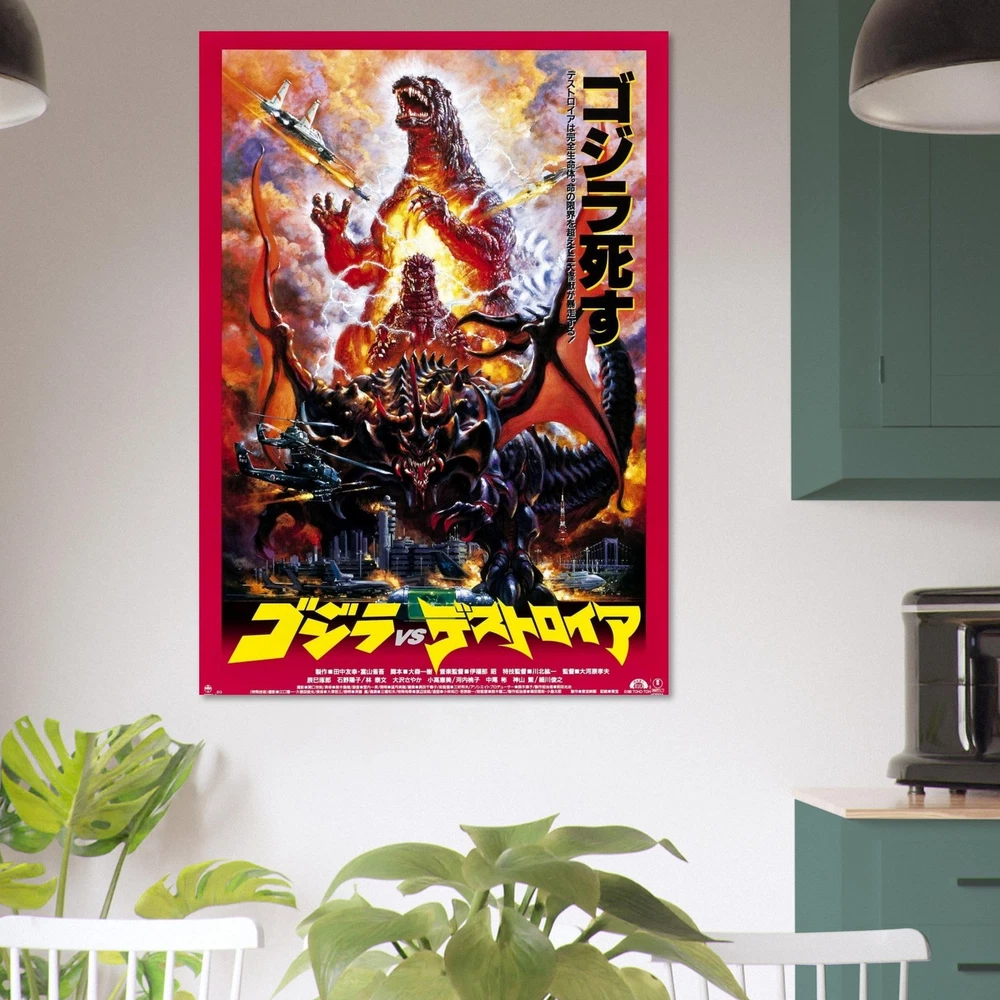 A dynamic vintage-style Japanese movie poster featuring an epic monster battle scene. Vibrant orange and red flames illuminate the dramatic composition, showcasing a fierce creature combat against a cityscape backdrop. The artwork captures intense action with bold colors and classic kaiju film aesthetic --- FREE SHIPPING FOR EACH EXTRA POSTER YOU ORDER! Our premium semi-glossy paper enhances colors with a subtle shine and protects against fading from light or moisture: Paper Finishing: Semi-glossy, enhances colors with a subtle shine. Paper Weight: 200 gsm (80 lb), thickness: 0.22 mm (8.7 mils). Sustainable Paper: FSC-certified or equivalent paper for sustainability.