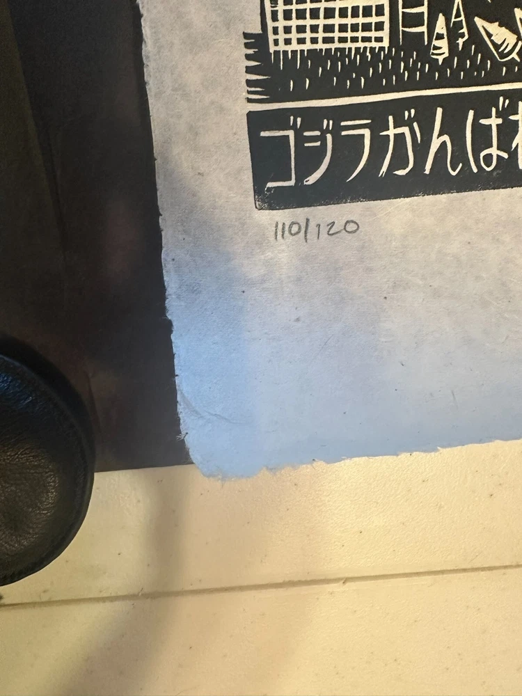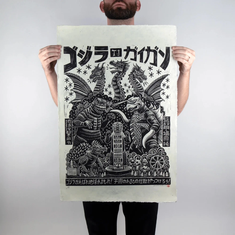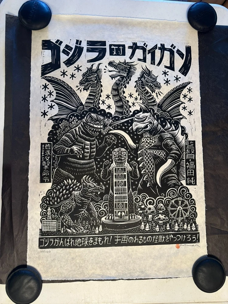 Godzilla vs Gigan Linocut Poster Attack Peter Mondo Toho Print Ships quick in a quality poster tube.
