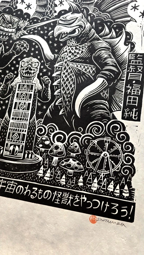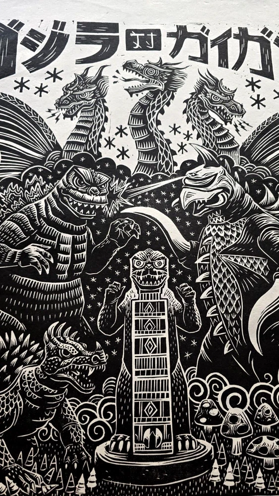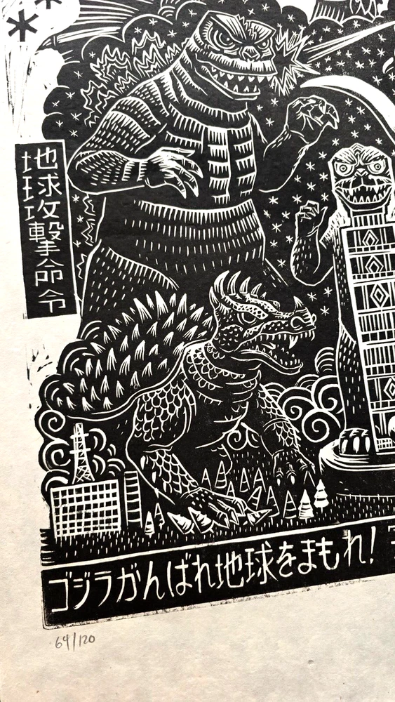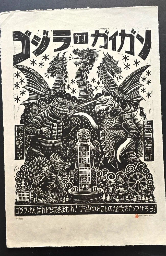 Godzilla vs Gigan Linocut Poster Attack Peter Rare 2020 Mondo Toho Print Sold Out Print Run: 120 Print Size: 20" x 30" Limited Edition: Signed and Numbered Condition : Like new condition no flaws. 20x30” Nepalese Lotka paper with deckled edges Carved and printed by Peter Santa-Maria, aka ATTACKPETER Signed, Stamped, and Hand-Numbered by the Artist Officially licensed by Toho Shipping Print will be properly packed and will be shipped in a sturdy shipping tube and insured for full value. Please message me with any questions. Thanks for looking!
