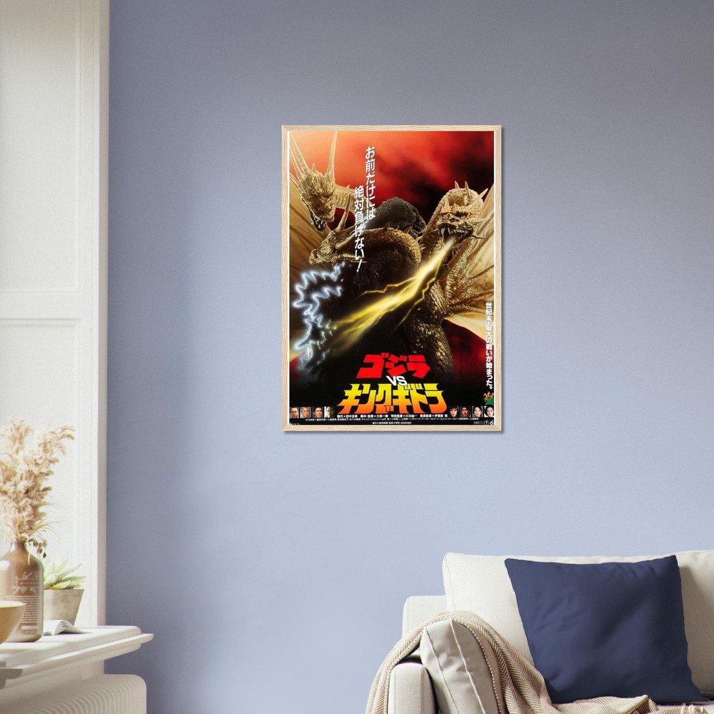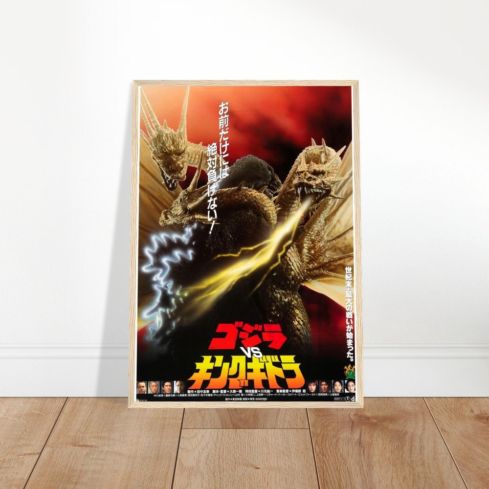 Dramatic movie poster featuring an epic clash between legendary kaiju monsters. Golden three-headed dragon Ghidorah faces off against Godzilla amid swirling red and orange atmospheric effects. Japanese text and electric blue energy beams add authentic vintage tokusatsu style to this intense monster battle scene --- Our sturdy wooden framed posters come ready to hang and are printed on heavyweight white matte paper with a smooth, luxurious finish—designed to stand the test of time: Ready-to-hang: Includes hanging kit, ready to hang directly on the wall. Frame Material: Durable pine wood. Frame Measurements: 20-25mm (0.79"-0.98") thick, 10-14mm (0.4"-0.6") wide. Paper Weight: 200 gsm (80 lb), thickness: 0.22 mm (8.7 mils). Paper Finishing: Matte, smooth, non-reflective surface. Protection: Shatterproof plexiglass protects the poster. Sustainable Paper: FSC-certified materials or equivalent.