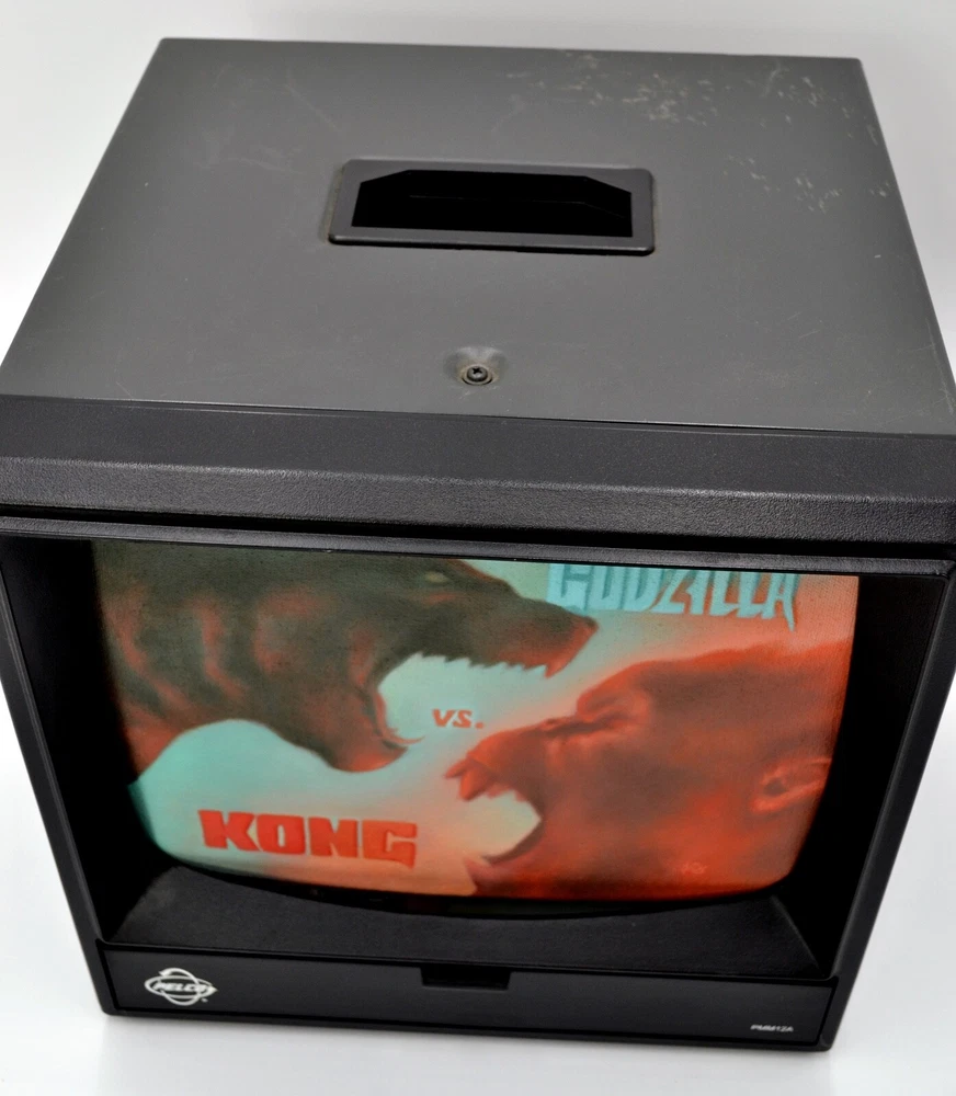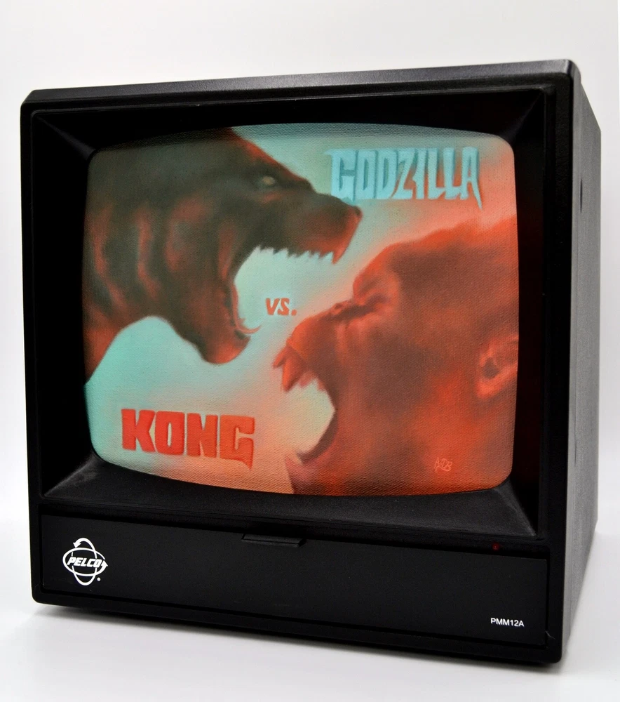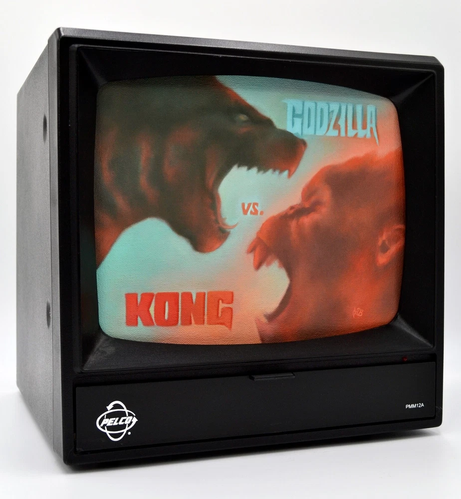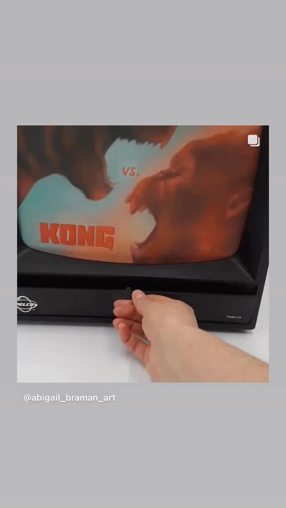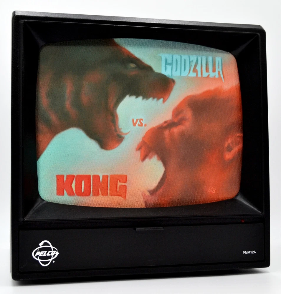 Godzilla vs Kong TV installation painting by artist Abigail Braman (me). Painting is 11"x8.5" oils on canvas, mounted within a 2004 Pelco television, 2021. This piece is wired up for sound and roars when turned on! Please refer to the video above to see, and please excuse the shaky cam and poor quality (that video was taken with an old camera phone). The tv is vintage and houses flaws, which makes it more unique. It has an open back to access the electronics and sits and should be displayed on a flat surface. If purchased, you will receive detailed instructions on how to properly use and care for this art piece. Please follow the instructions carefully, as being reckless with this piece can result in damage. Television dimensions: 12"x12"x12" My artwork has been displayed in galleries throughout the country, including Modern Eden Gallery, Arch Enemy Arts, and Gallery1988. Director Adam Wingard has seen this piece, and he loved it! This painting is also crossposted on my website- there are no duplicates . abigailbraman.com Please follow me on Instagram for more content: @abigail_braman_art I ship very quickly, but please allow for an extra few days for larger art pieces to go out. They can take a little more time to box up. This piece ships safely and securely, with insurance.