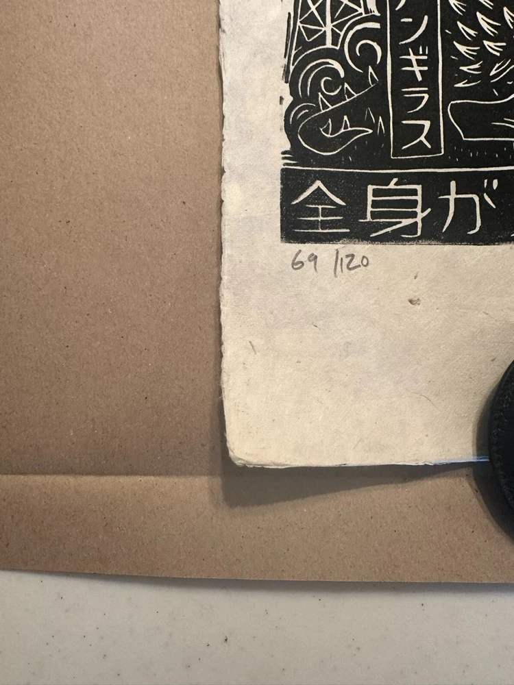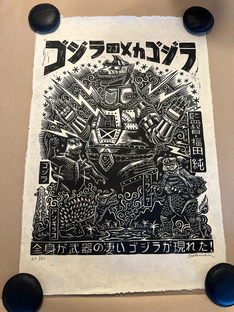 Created by artist Peter Santamaria, this print is a must-have for fans of the classic movie franchise. The print is signed by the artist and produced using the linocut printing technique. This rare 2020 Mondo Toho print will make a great addition to any art collection. Ships quick in a quality poster tube.