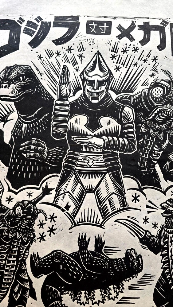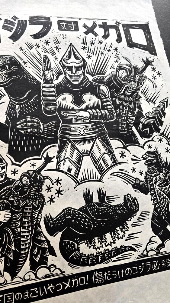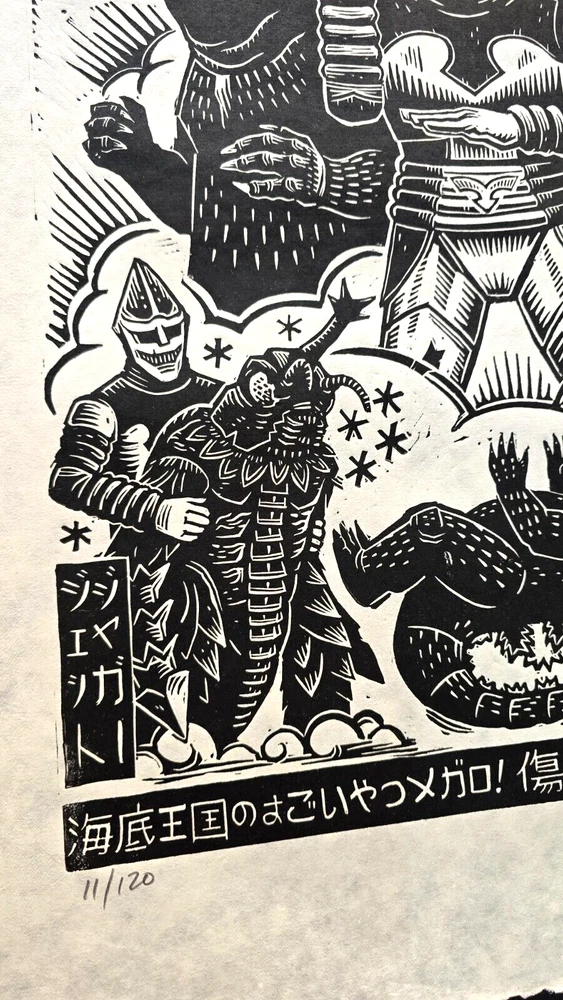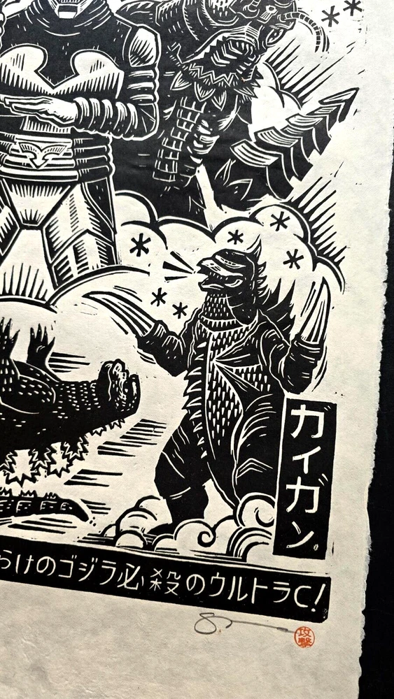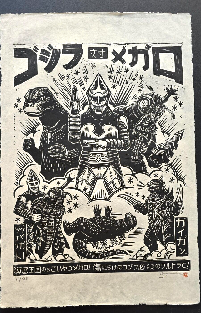 Godzilla vs Megalon Linocut Poster Attack Peter Rare 2021 Mondo Toho Print Print Run: 120 Print Size: 20" x 30" Limited Edition: Signed and Numbered Condition : Like new condition no flaws. 20x30” Nepalese Lotka paper with deckled edges Carved and printed by Peter Santa-Maria, aka ATTACKPETER Signed, Stamped, and Hand-Numbered by the Artist Officially licensed by Toho Shipping Print will be properly packed and will be shipped in a sturdy shipping tube and insured for full value. Please message me with any questions. Thanks for looking!