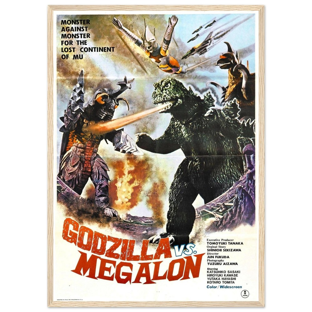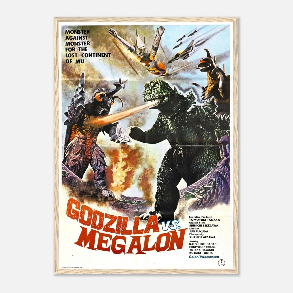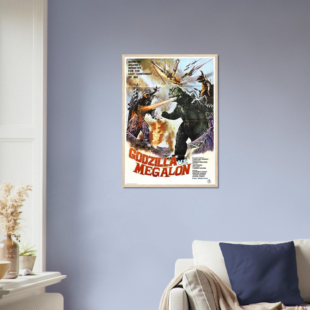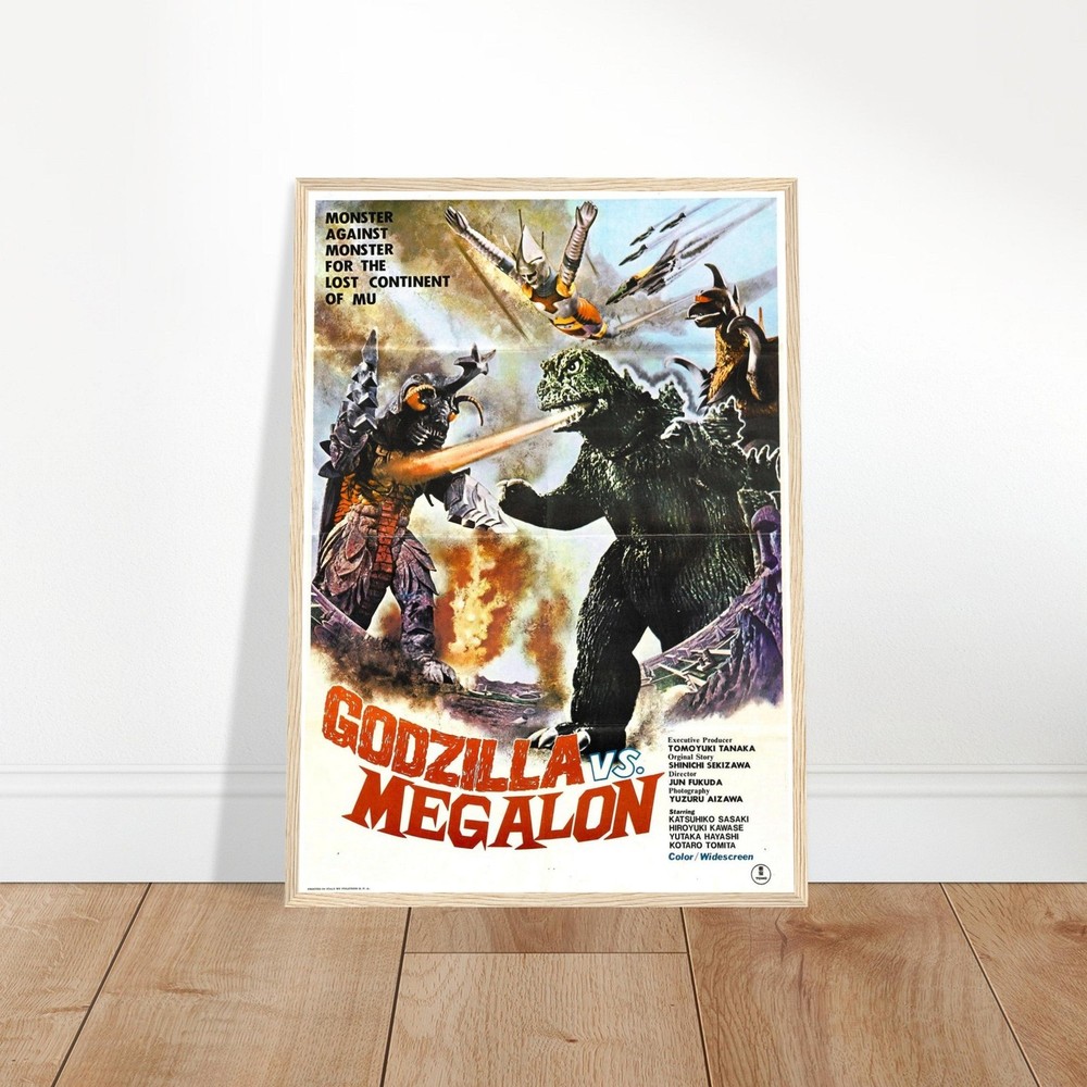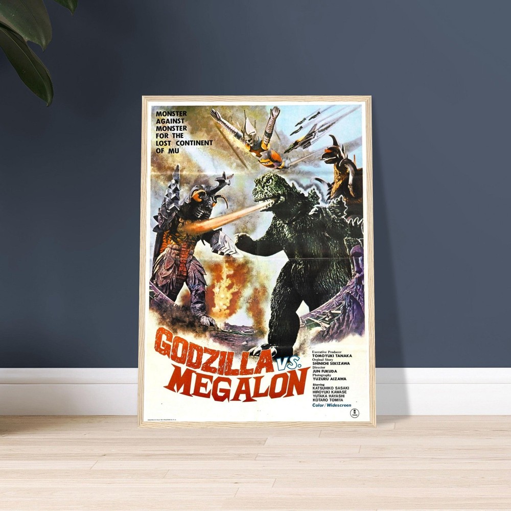 Iconic vintage Japanese movie poster featuring an epic monster battle scene. Dynamic composition showcases Godzilla in combat with dramatic explosions and action. Classic kaiju artwork with vibrant colors and retro sci-fi aesthetic that captures the golden age of monster movies --- Our sturdy wooden framed posters come ready to hang and are printed on heavyweight white matte paper with a smooth, luxurious finish—designed to stand the test of time: Ready-to-hang: Includes hanging kit, ready to hang directly on the wall. Frame Material: Durable pine wood. Frame Measurements: 20-25mm (0.79"-0.98") thick, 10-14mm (0.4"-0.6") wide. Paper Weight: 200 gsm (80 lb), thickness: 0.22 mm (8.7 mils). Paper Finishing: Matte, smooth, non-reflective surface. Protection: Shatterproof plexiglass protects the poster. Sustainable Paper: FSC-certified materials or equivalent.