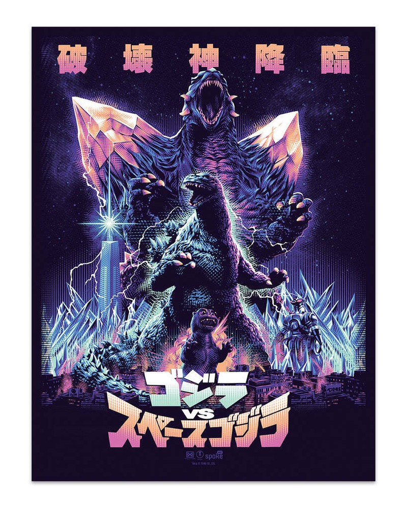 Godzilla vs. Space Godzilla An official, limited edition print by artist Tracie Ching Edition: Limited Edition of 150 Technique: screen print Dimensions: 18" x 24" Markings: hand-numbered Mint condition; stored flat in an archival sleeve. From the 1994 film Godzilla vs. Space Godzilla directed by Kensho Yamashita and starring Jun Hashizume, Megumi Odaka, Zenkichi Yoneyama.