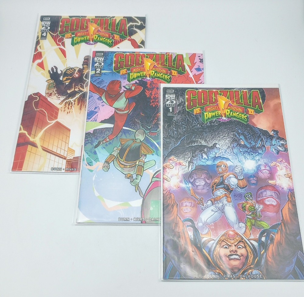 Brand new, in protective sleeve. Issues #1, #2, and #4. Godzilla vs. MMPR II, cover A, 2024.