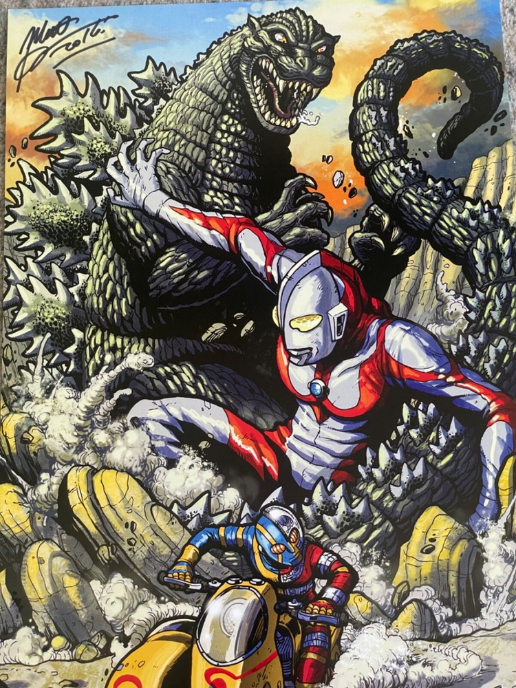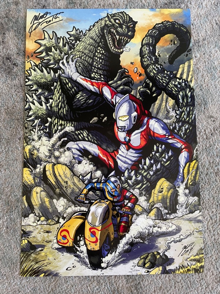 Own an iconic piece of art with the Godzilla vs Ultraman vs Kikaider Art Print by Matt Frank (2016), SIGNED. This dynamic print features a thrilling battle scene between Godzilla, Ultraman, and Kikaider, brought to life with Matt Frank’s intricate artwork. Measuring [insert dimensions], this limited edition print is hand-signed by the artist, making it a must-have for fans of kaiju and tokusatsu. Perfect for collectors and enthusiasts, don’t miss out on adding this exclusive piece to your collection! This Art Print is in EXCELLENT condition and was SIGNED by Matt Frank in 2016! OPEN TO QUALIFYING OFFERS!!! Please contact me if you have any questions.