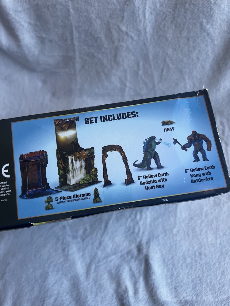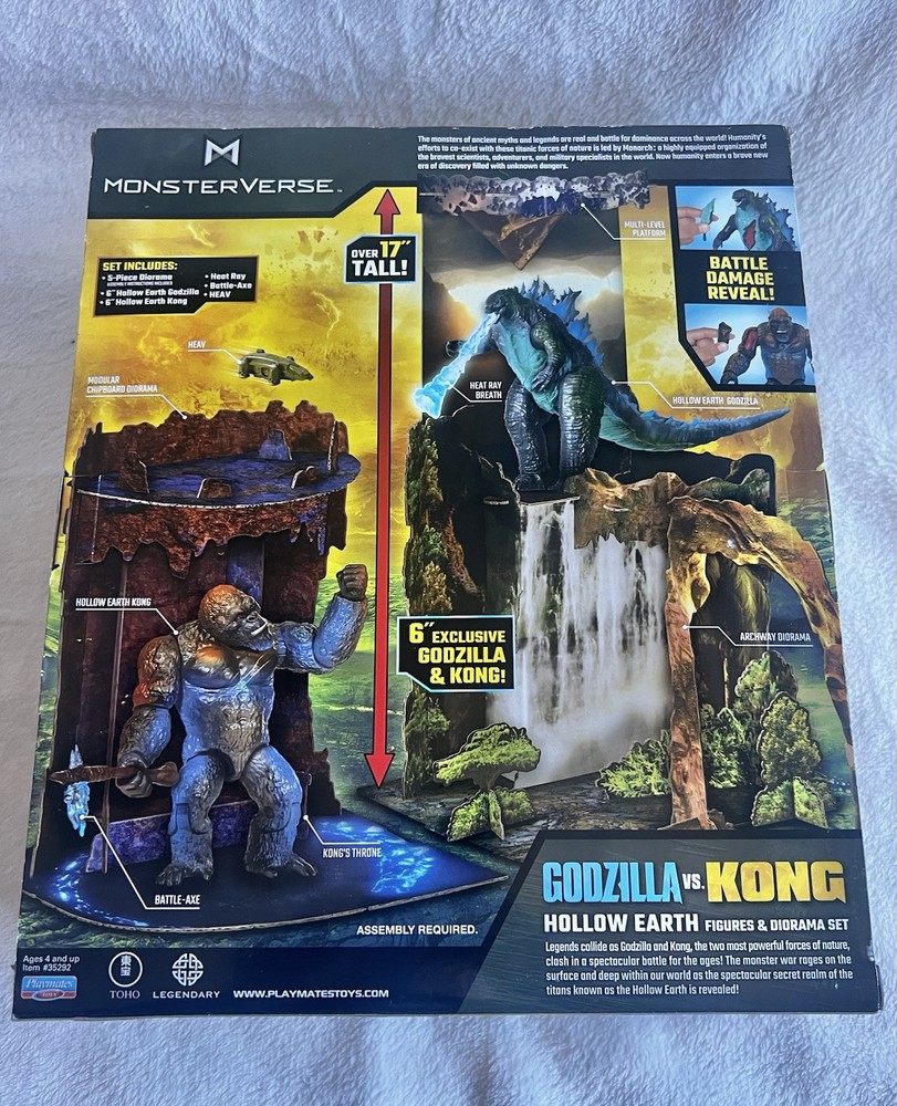 Brand new sealed box 6" Godzilla and Kong figures are articulated for battle-ready poses Also includes Godzilla's Heat Ray, Kong's Battle Axe, HEAV Vehicle and Jet Fighter accessories Both figures come with “battle damage” feature—remove to reveal the powerful impact of their terrible clash Multi-piece, multi-level Hollow Earth diorama to reenact the exploration of Hollow Earth as seen in the 2021 movie Harness the awesome power of Godzilla's thunderous roar and devastating tail-swipe as he battles the powerful Kong to settle an ancient rivalry