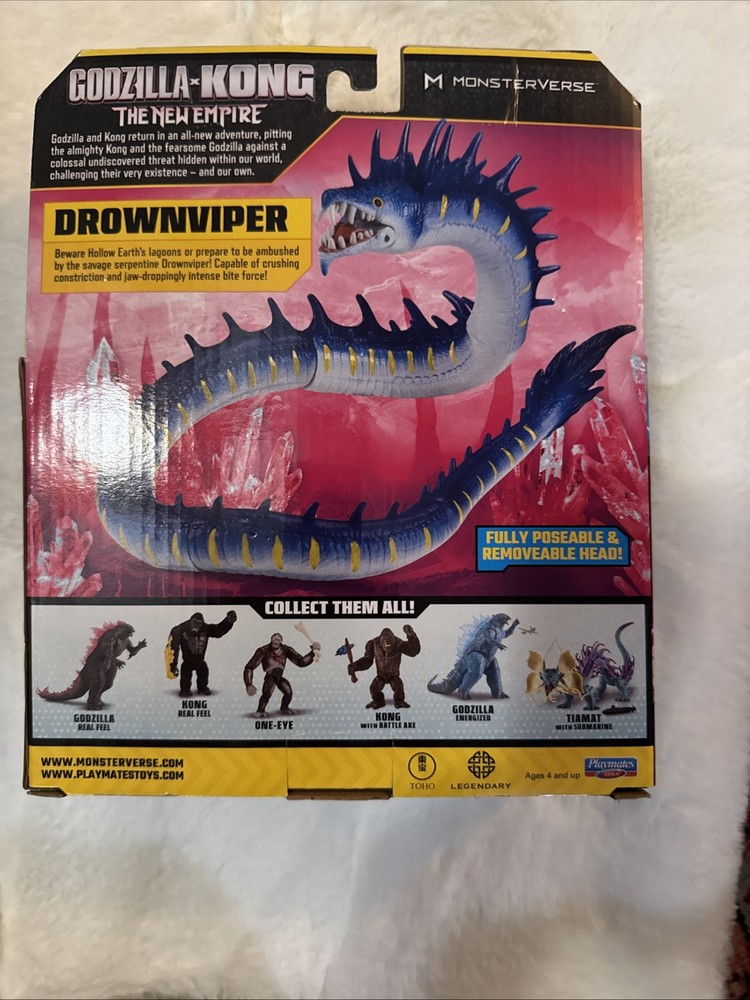 The Godzilla x Kong New Empire Drownviper Action Figure is a highly detailed and collectible toy inspired by the popular movie franchise. Standing at 7 inches tall, this plastic figure features the fearsome Drownviper character from the Godzilla x Kong: The New Empire film. Part of the Monsterverse series by Playmates, this action figure is a must-have for fans of Godzilla and King Kong, showcasing the blue-colored snake creature in a dynamic pose ready for battle. With its intricate design and attention to detail, this action figure is a perfect addition to any action figure collection.