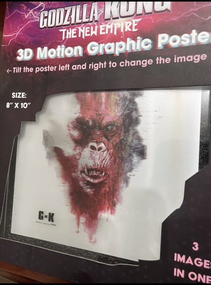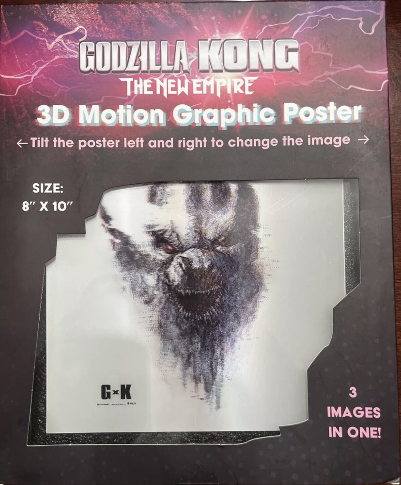 Get ready to battle with this stunning Godzilla x Kong The New Empire 3D Motion Graphic Poster! This wall art features three images of the iconic characters. Measuring 8x10 inches, this framed poster is made of high-quality canvas material and is perfect for any fan of the Godzilla universe. The poster is an original licensed reproduction produced in 2024, and is not signed. It is ideal for collectors of merchandise and memorabilia, and would make a great addition to any collection. Don't miss out on the chance to own this amazing piece of art!