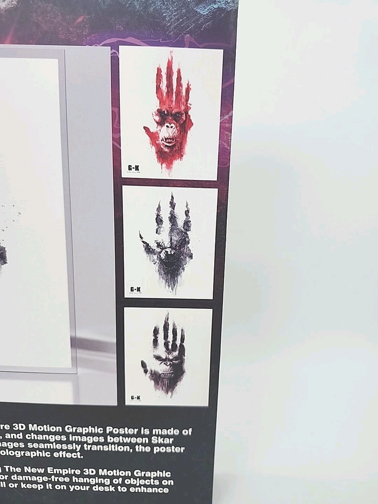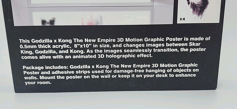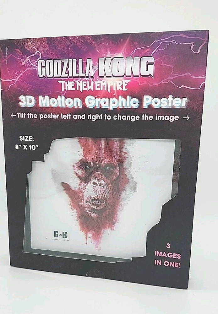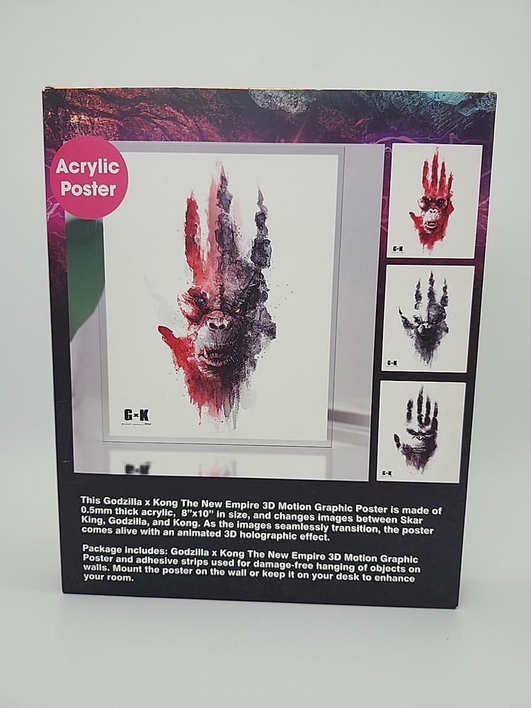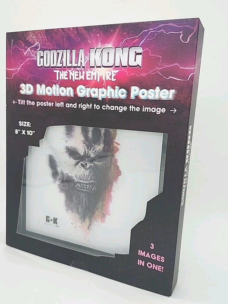 3 images in one ! Acrylic poster 8"x10" . Shows 3 different images as you move ithe poster or you move as the poster stays still. As the images seamlessly transition, the poster comes alive with an animated 3D holographic effect. Images change between Skar King,Godzilla and Kong. Sealed New package includes: Graphic poster and adhesive strips used for damage-free hanging of objects on walls. Either Mount poster on the wall or keep it on your desk . Fast secure shipping Thank you
