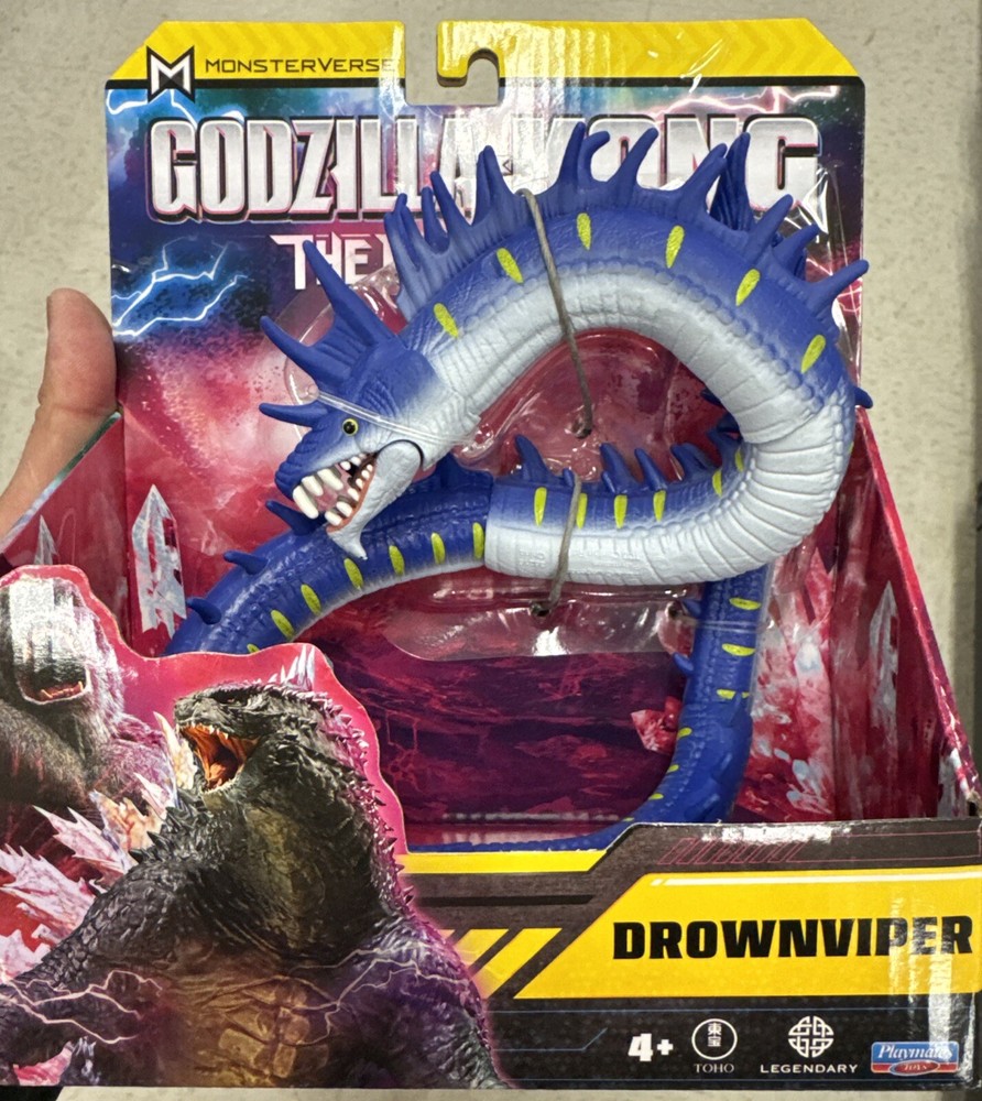 This is a Playmate action figure from the Godzilla x Kong: The New Empire series, specifically the Drownviper character. It is from the year 2024 and is recommended for ages 4 and up. The figure features a Godzilla theme and is designed for children aged 8-11 years.