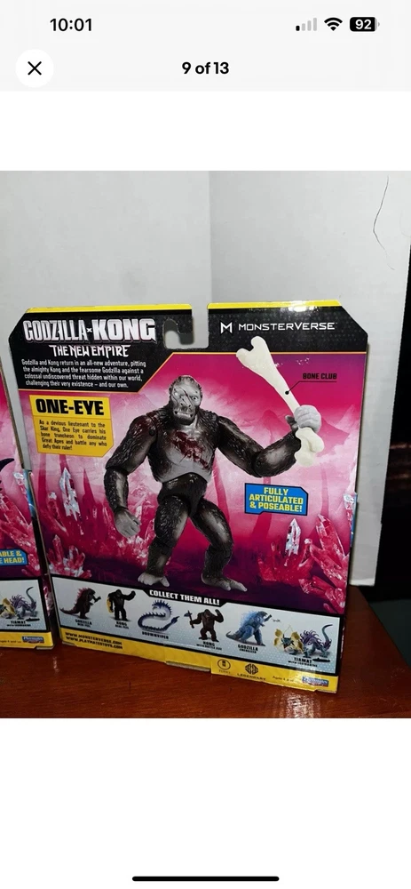 You are getting the two figures pictured! See pictures for package condition. There is minimal shelf wear. Will be shipped in a box. These are getting harder to find. The "Godzilla x Kong The New Empire ONE EYE & DROWNVIPER 7" Action Figure" set includes figures of Godzilla, Tiamat, and King Kong from the Monsterverse franchise. Made of plastic and in a 1:12 scale, this 2-figure set is part of the Playmates brand and was manufactured in 2024. The figures stand at 7 inches tall and feature a multicolor design, representing characters from the Godzilla x Kong movie "The New Empire."